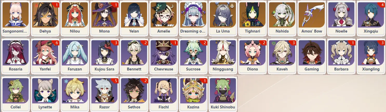 [EU]AR45|Five Stars*10[Lauma+Nahida+Yelan+Nilou+Sangonomiya Kokomi+Amelie+Dehya*1+Mona*1+Tighnari+Yumemizuki Mizuki]Four stars*23|See description and pictures for details