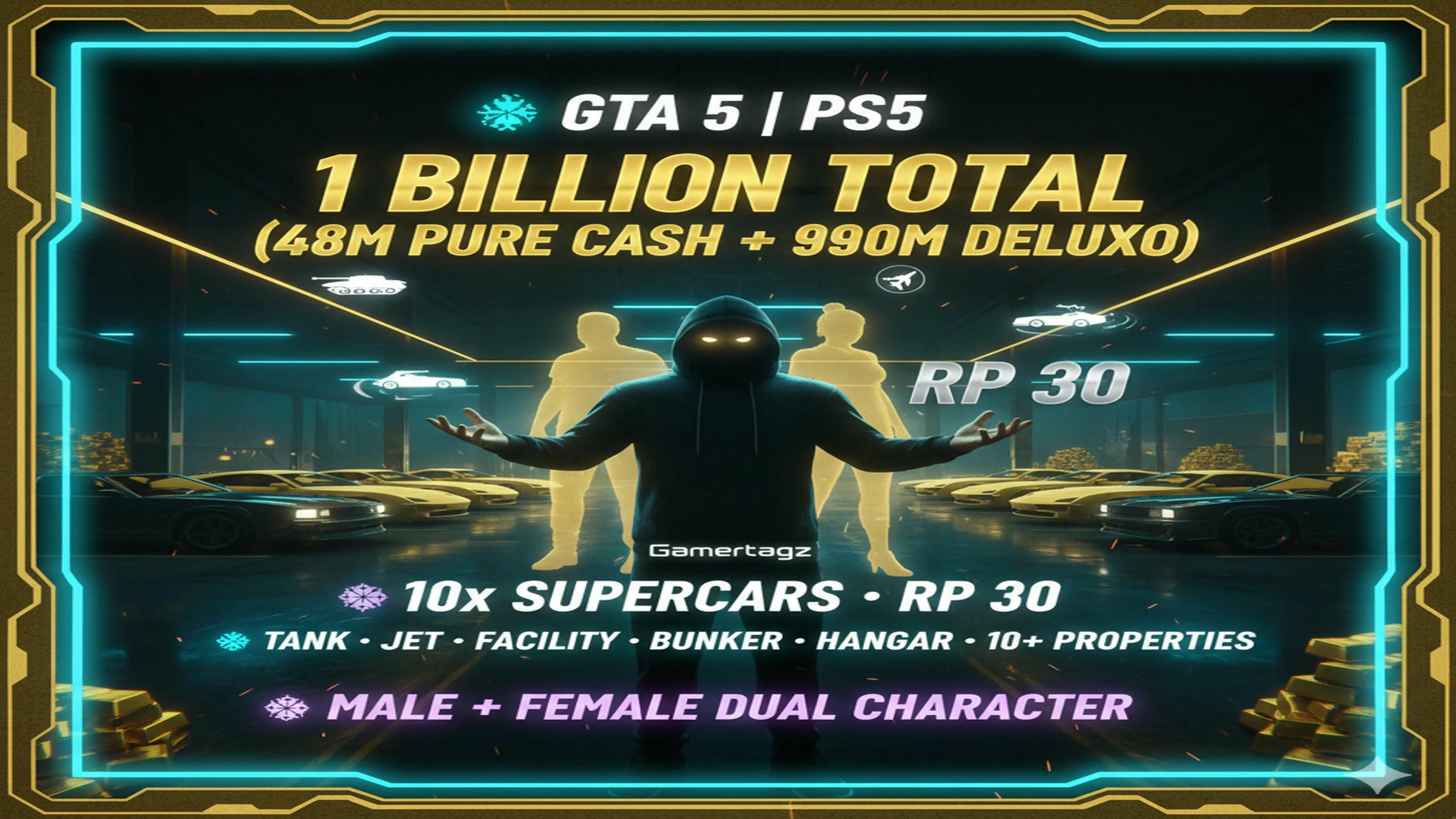 🔈 Advanced 🔈 GTA 5 | PS5 🔈 1 Billion Total ( 47 Million Pure Cash + 990 Million Worth Deluxo ) 🔈 10x Supercars 🔈 RP 37 🔈 Tank 🔈 Jet 🔈 Facility 🔈 Bunker 🔈 Hangar 🔈 10+ Properties 🔈 Male + Female Dual Character Instant Access 🔈 #sS6uBk