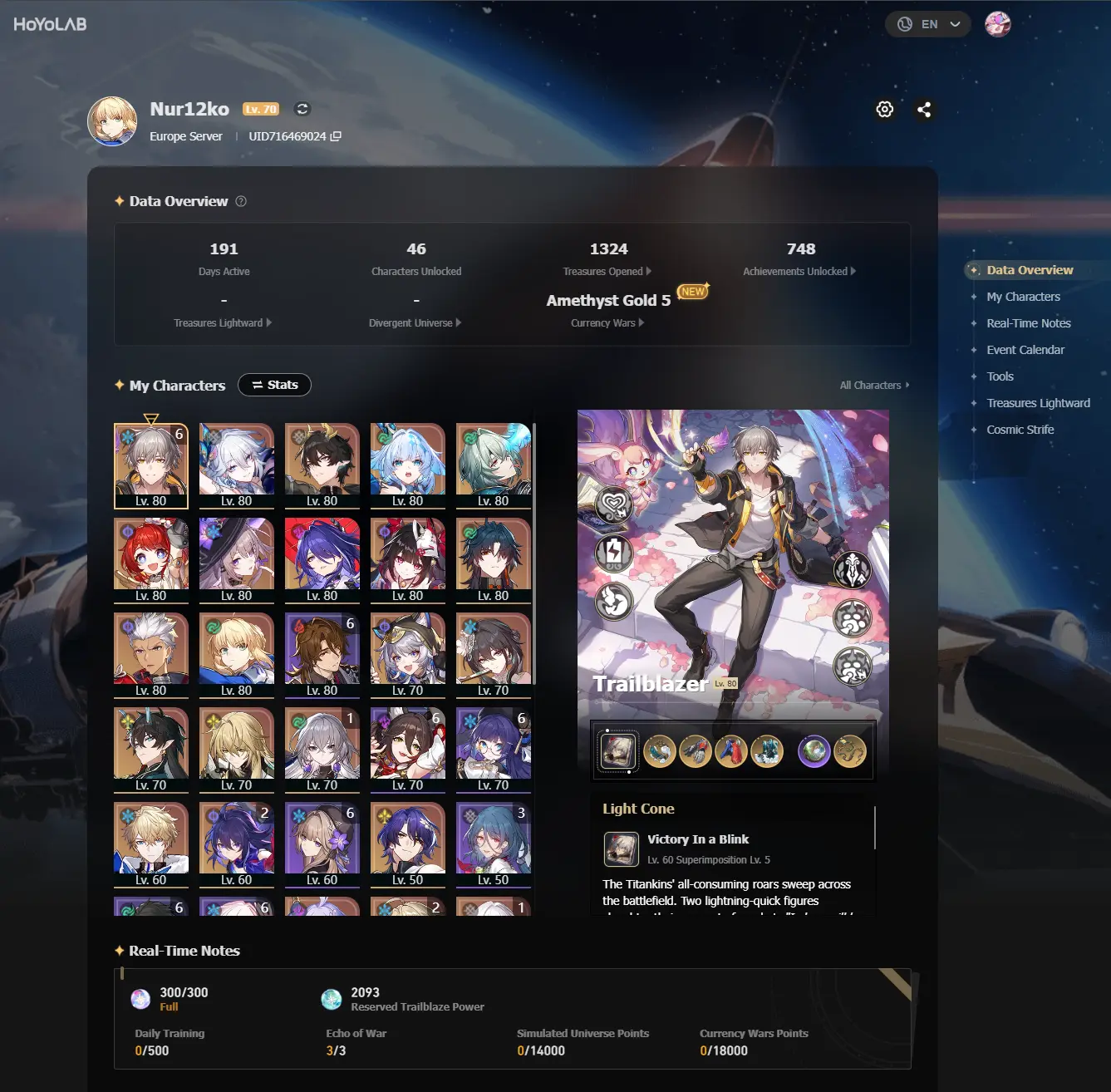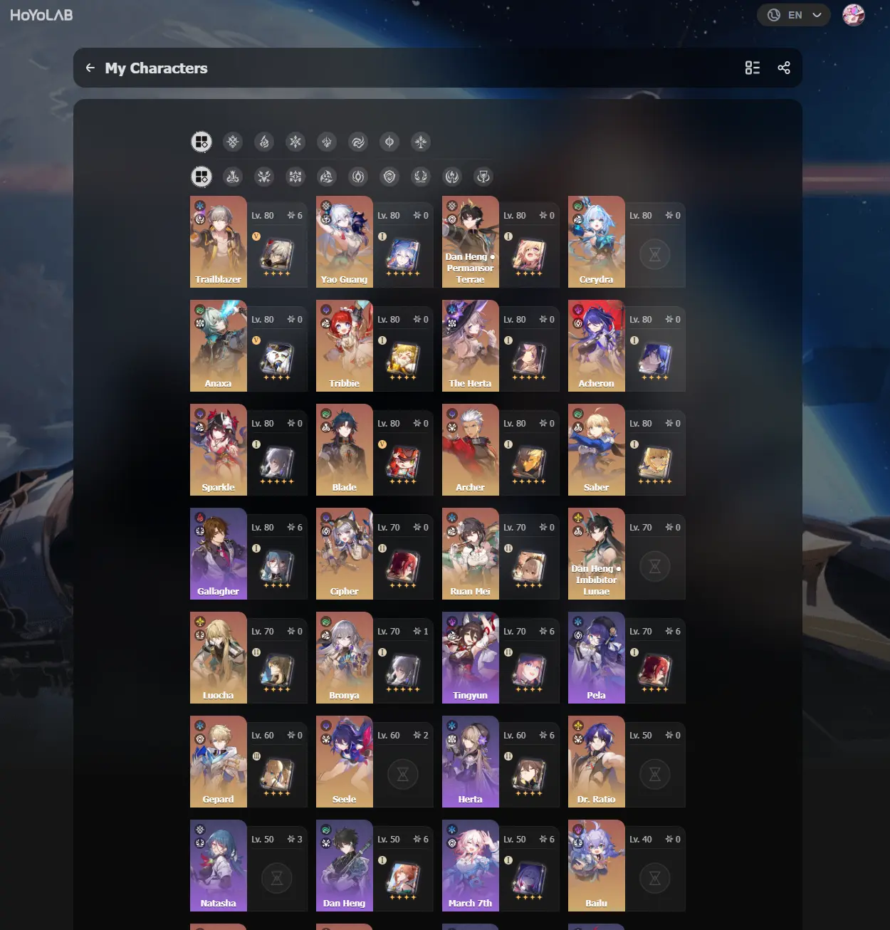 #HK2199 Europe TL70 | LEGS:43 | Seele E2+Yanqing E2+Bronya E1+Clara E1+Welt E1+Acheron+Sparkle+Blade+Ruan Mei+DHIL+Luocha+Dr.Ratio | LEG HEROES/CONES: 24/6