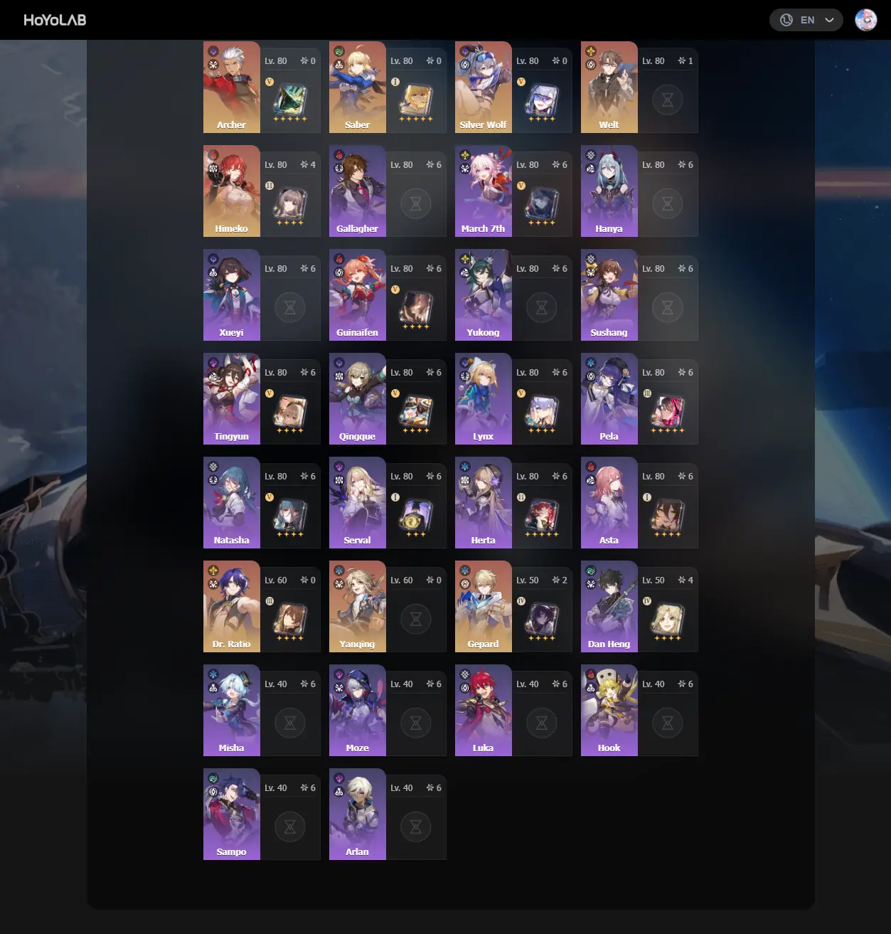 #HK2206 Asia TL70 | HSR | LEGS:55 | BIG GENSHIN + ZZZ | Ashveil+Yao Guang+Cyrene+Evernight+Hyacine+Castorice+The Herta+Blade+Topaz+Seele+Silver Wolf | LEG HEROES/WEAPONS: 32/18