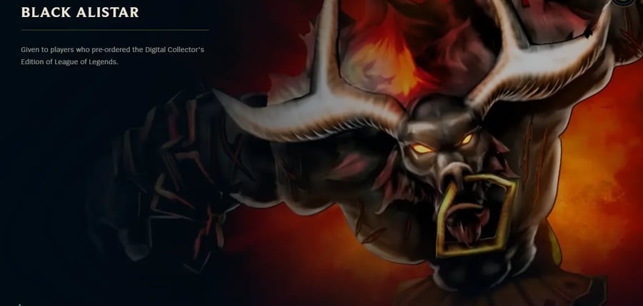 Black Alistar ist der erste Nicht-Klassik-Champion-Skin, der je in League of Legends veröffentlicht wurde. Er wurde am 13. Juni 2009 als exklusiver Vorbesteller-Bonus für die digitale Version der League of Legends Collector’s Edition angeboten, sodass Spieler den Bundle-Kauf tätigen mussten, bevor das Spiel ein offizielles Erscheinungsdatum hatte, um diesen Skin zu erhalten.