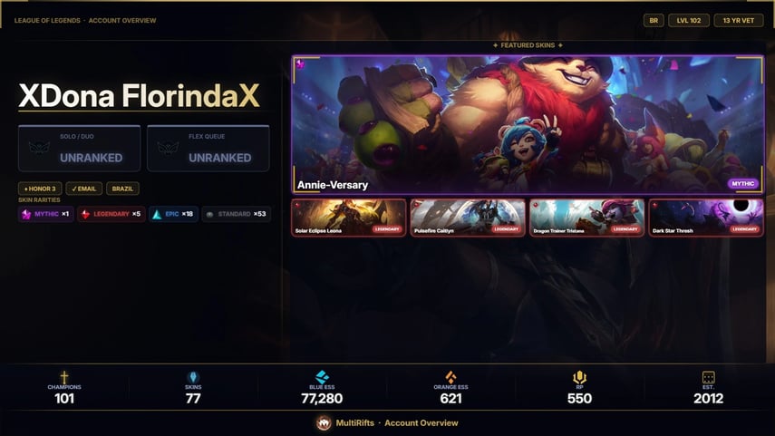 ![【TW】 ⸱ 👑 LEVEL 355 ⸱ 🏆 S4 84LP ( S4 LAST SEASON ⸱ S2 FLEX ) ⸱ ✨ 286 SKINS ( 4 URS SKINS ) 💳 [ 315154 BE , 30 RP , 57 MESS ] ⸱ ⭐ HONOR LVL 1 ⸱ 172 CHAMP ⚔️](https://cdn.gameboost.com/games/league-of-legends/tiers/sm/Silver.webp)