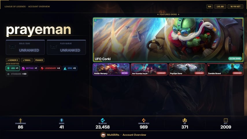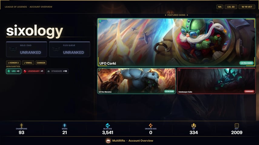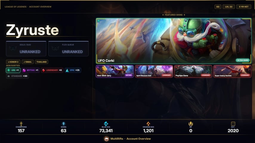![【SG】 ⸱ 🌟 LEVEL 210 ⸱ 🏆 UNRANKED ⸱ ✨ 1071 SKINS ( 3 URS SKINS ) 🪙 [ 21800 BE , 101 RP , 110 MESS ] ⸱ 🤝 HONOR LVL 3 ⸱ 165 CHAMP 🛡️](https://cdn.gameboost.com/games/league-of-legends/tiers/sm/Unranked.webp)