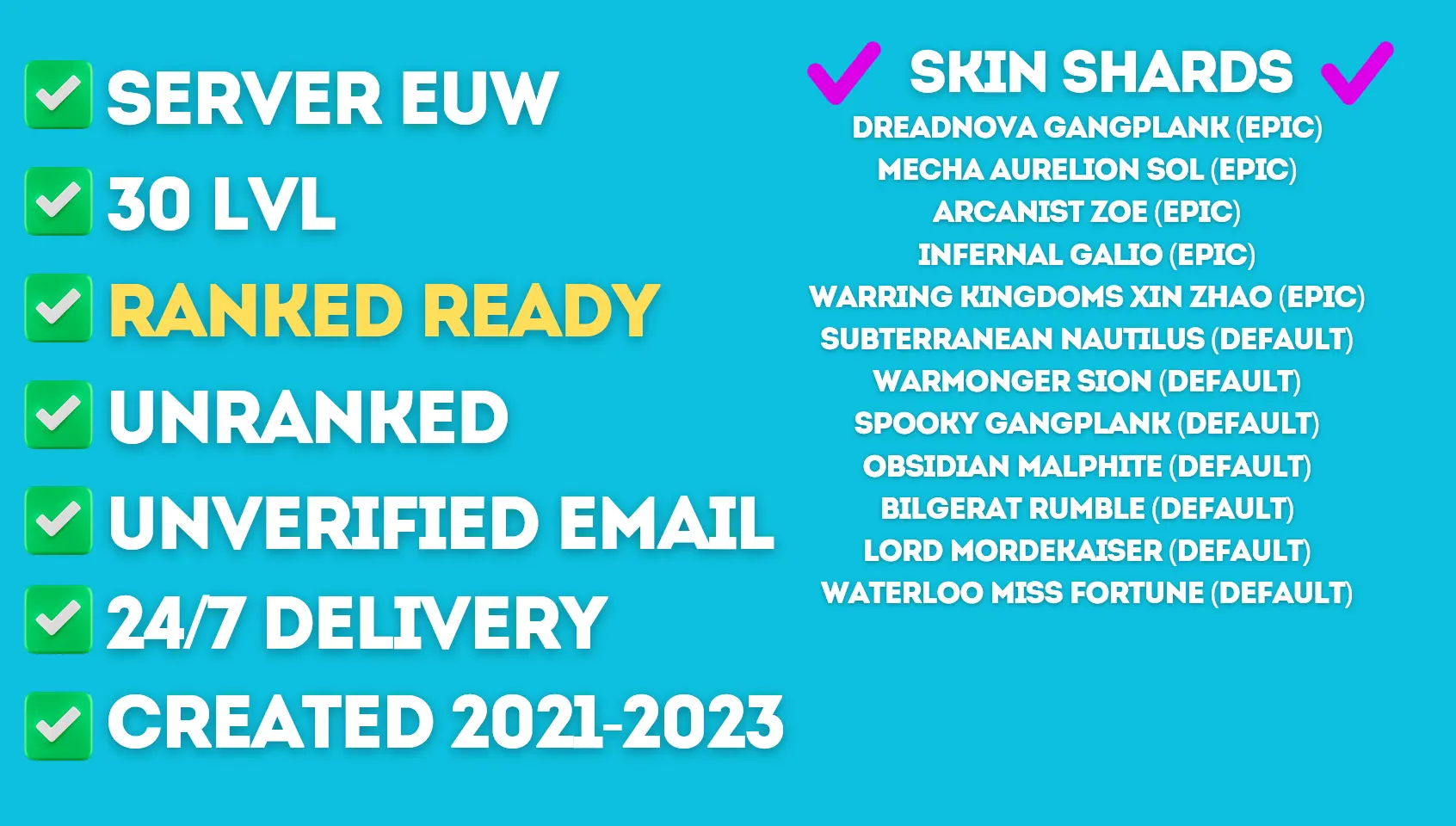 EUW 30 LvL ✅ Ranked Ready ✅ BE: 62045 ✅ Unverified ✅ Unranked ✅ Shards: Dreadnova Gangplank, Mecha Aurelion Sol, Arcanist Zoe, Infernal Galio, Warring Kingdoms Xin Zhao, Subterranean Nautilus, Warmonger Sion, Spooky Gangplank, Obsidian Malphite
