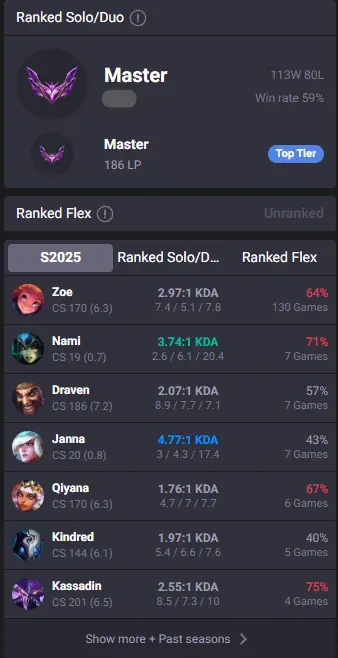 Master I  (59% WR)  Unranked