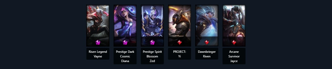 UnRanked┃26 skins┃94 Champs┃(3 Mythic) Risen Legend Vayne Arcane Survivor Jayce Prestige Spirit Blossom Zed Prestige Dark Cosmic Diana Dawnbringer Riven PROJECT: Yi Dawnbringer Janna