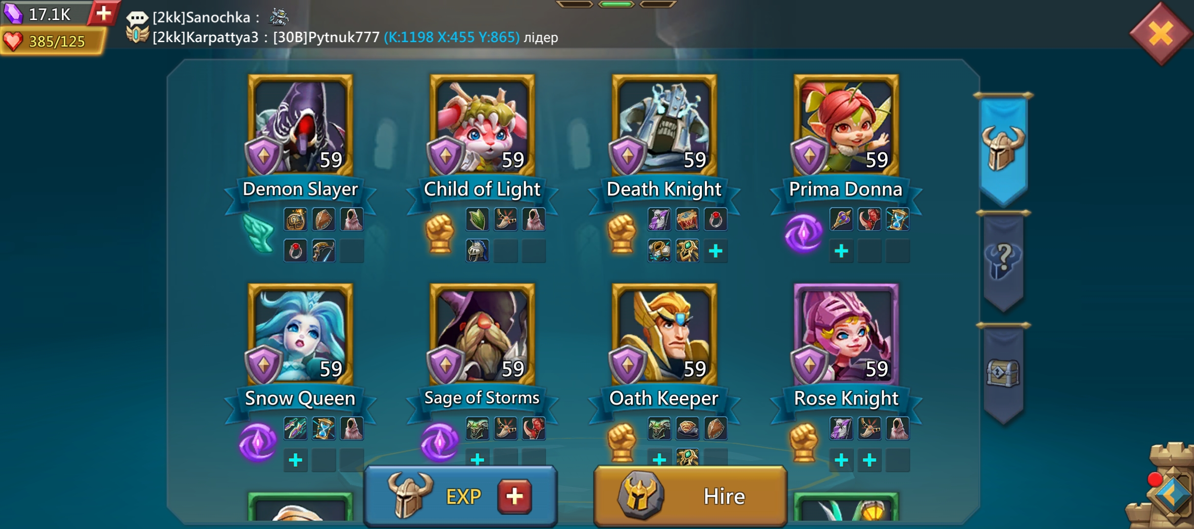 Player level 59 | 164 Million+ might | Troops killed 24 Million+ | Adventure level 16 | VIP 12 | Total Heroes 17 |