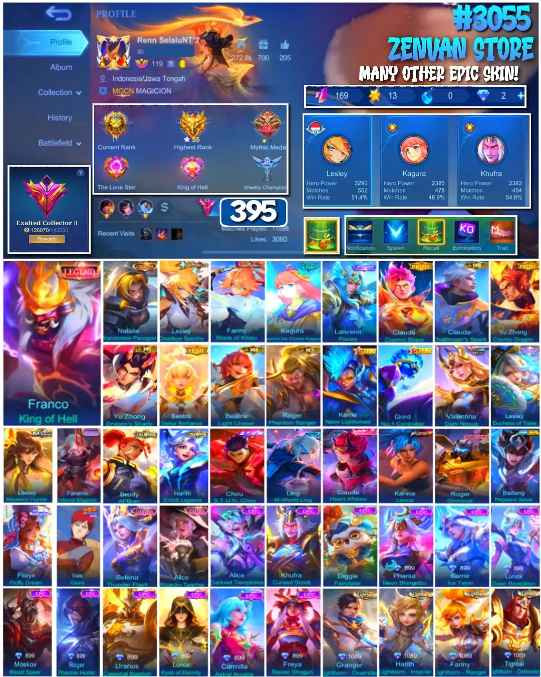 #3055 🔥 395 Skins 🔥 Legend Franco 🔥 Collector Natalia 🔥 Aspirant Lesley, Fanny 🔥 Clouds Kagura 🔥 Prime Claude, Yu Zhong, Beatrix 🔥 Stun Chou 🔥 Mword Ling 🔥 Transformers Roger 🔥 KoF Karina 🔥 Many Limited 🔥 Many Epic 🔥 Safe Account ✅