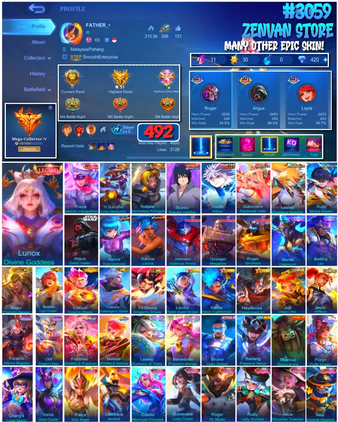 #3059 🔥 492 Skins 🔥 Legend Lunox, Freya 🔥 Collector Yin Sun Shin, Natalia 🔥 Sasuke 🔥 HunterXHunter Killua 🔥 Aspirant Guinevere, Lesley, Ruby 🔥 Many Limited 🔥 Many Epic 🔥 Safe Account ✅
