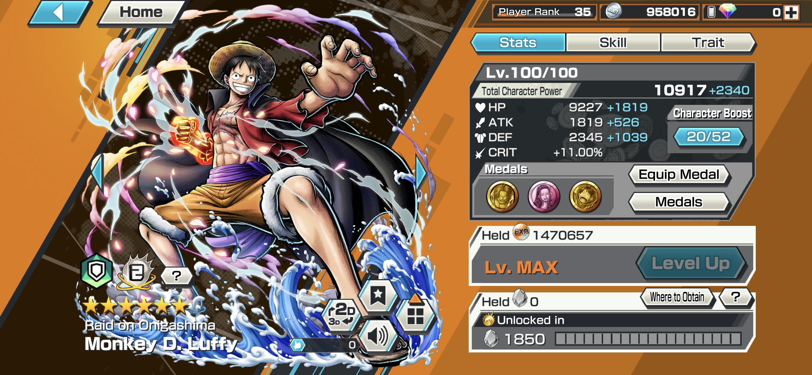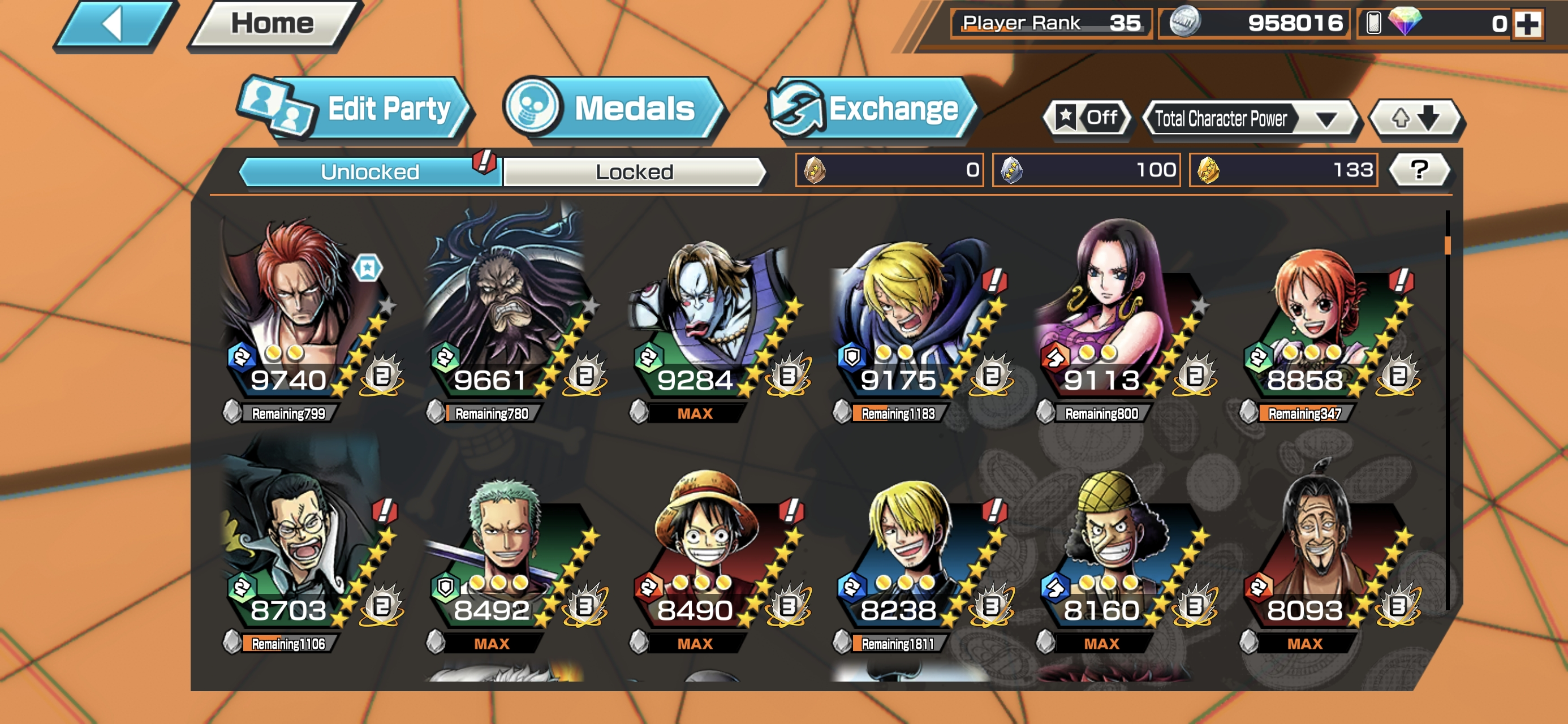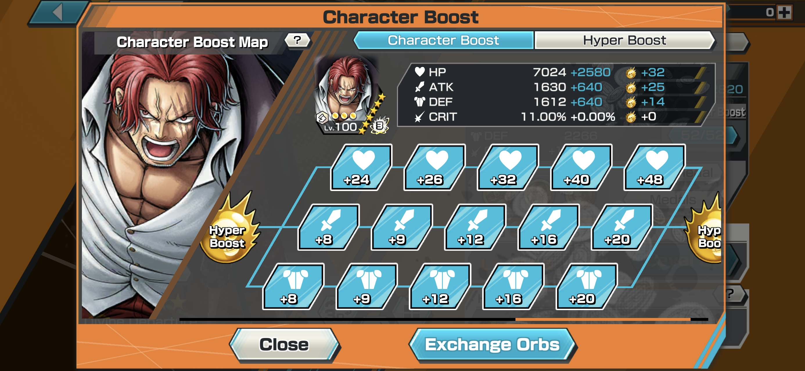 HB 16 ⸱ 6 Ex Meta 3 Max ⸱ SHANKS MAX FULL BOOST 3 ⸱ Roger Max ⸱ Kuzan Max ⸱ Akainu ⸱ Luffy ⸱ Shanks ⸱ Monkey GARP MAX ⸱ Nico Robin Max ⸱ Support 147 ⸱ Good Medal ⸱ Gems ⸱ Many Medal Material ⸱ B470