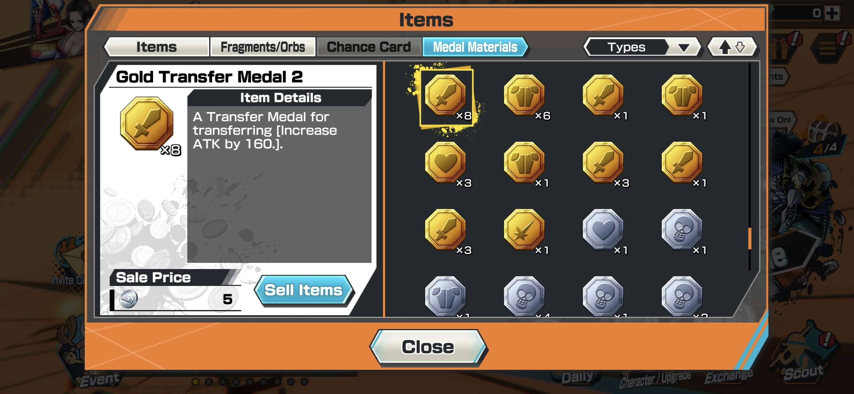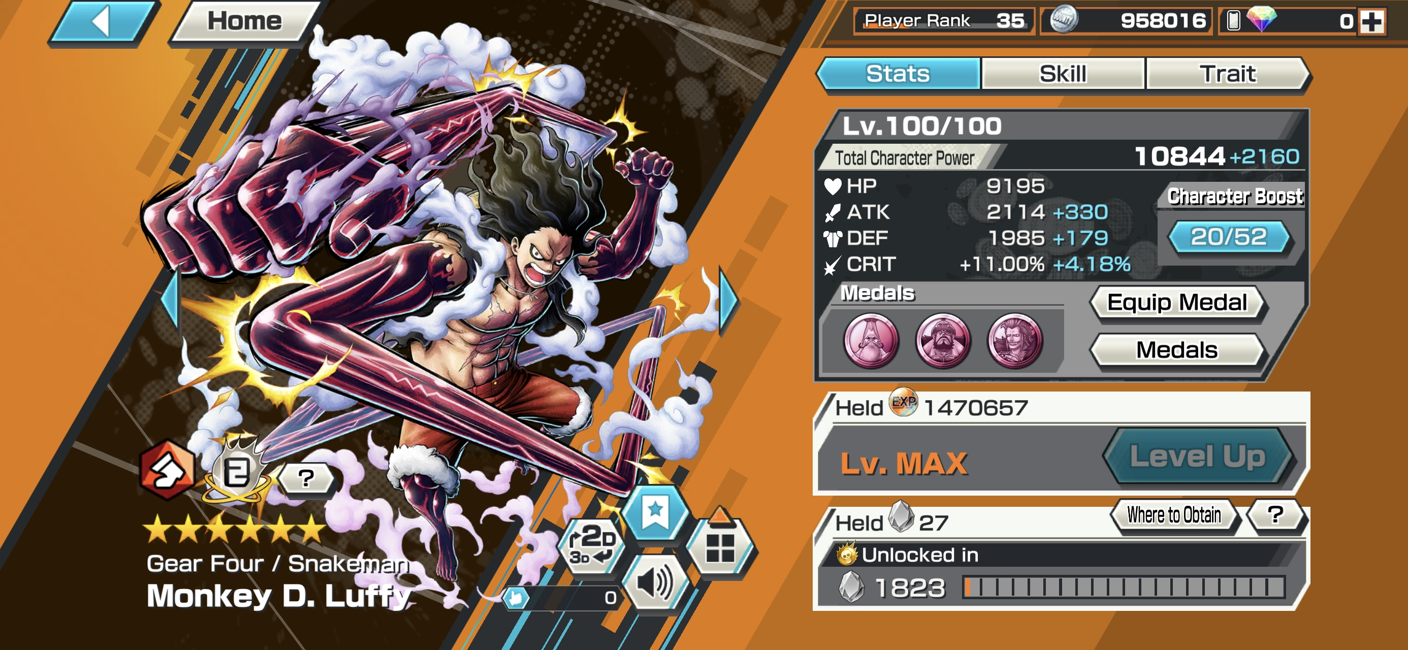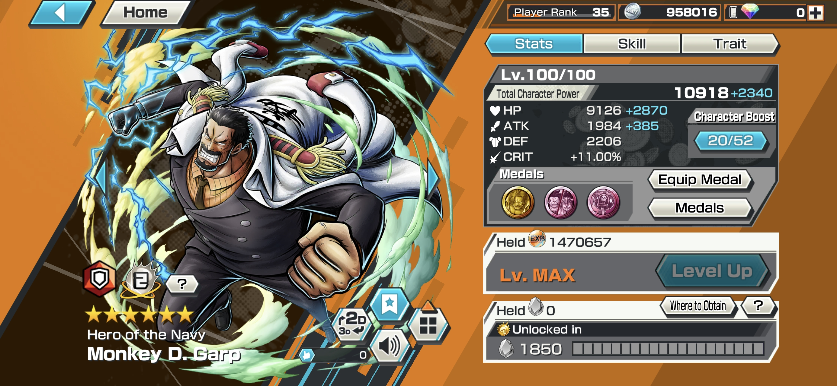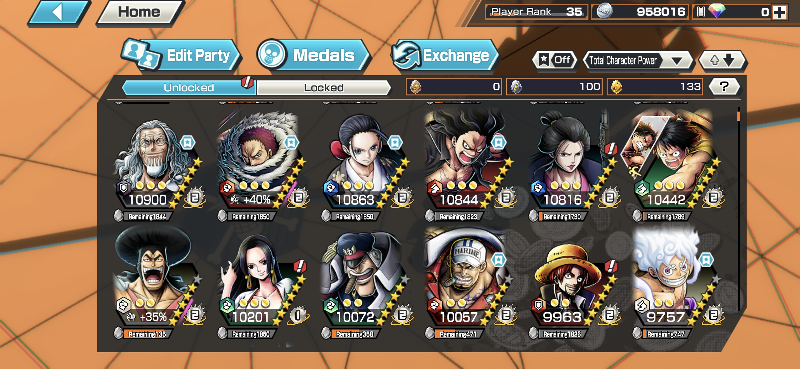 HB 16 ⸱ 6 Ex Meta 3 Max ⸱ SHANKS MAX FULL BOOST 3 ⸱ Roger Max ⸱ Kuzan Max ⸱ Akainu ⸱ Luffy ⸱ Shanks ⸱ Monkey GARP MAX ⸱ Nico Robin Max ⸱ Support 147 ⸱ Good Medal ⸱ Gems ⸱ Many Medal Material ⸱ B470