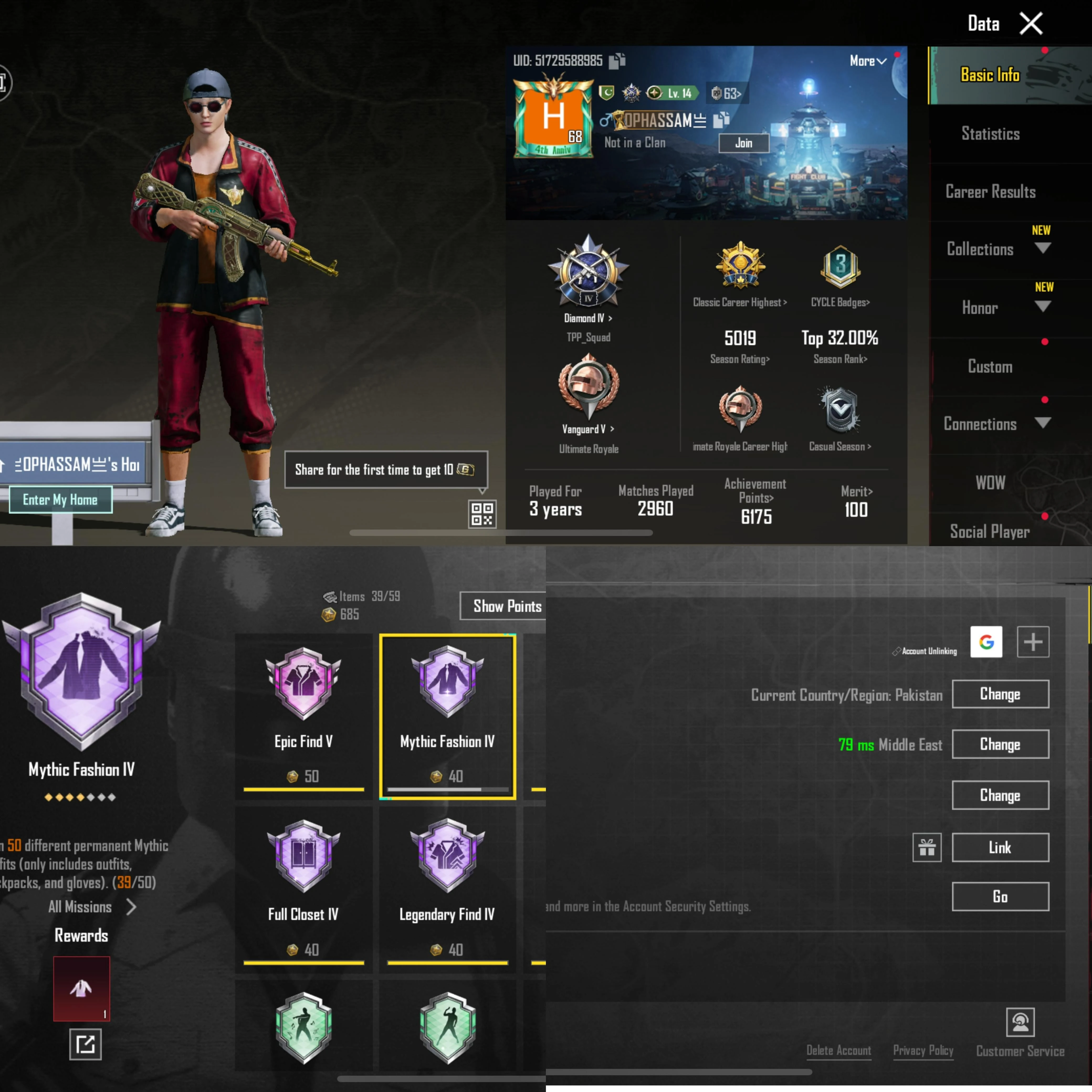 Level 68 🔹 39 Mythics 🔹 Extra Mythics 🔹 14 Gun Labs 🔹 MK Galaxy L4 🔹 AKM L4 🔹 Thompson L1 🔹 AWM L1 🔹 UZI L1 🔹 Pan L1 🔹 MG3 L1 🔹 Machete L1 🔹 P213