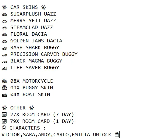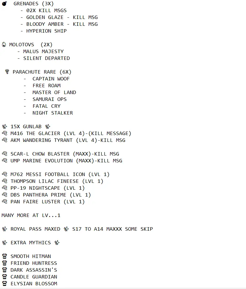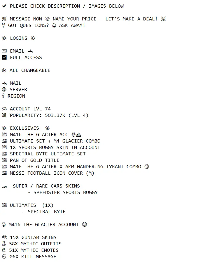 👻 SPECTRAL BYTE ULTIMATE 🔫 M416 GLACIER + AKM WANDERING⚔️ KILL MSGS 🚗 SPORTS CAR BUGGY 💥 15x GUNLAB 💀 6x KILL MESSAGES 🏆 PAN OF GOLD TITLE 👑 MESSI FOOTBALL ICON COVER (M) 🔥 RARE EMOTES 🎭 MYTHICS 💎 HELMETS 🪖 BACKPACKS ✨ SECURE 🔐