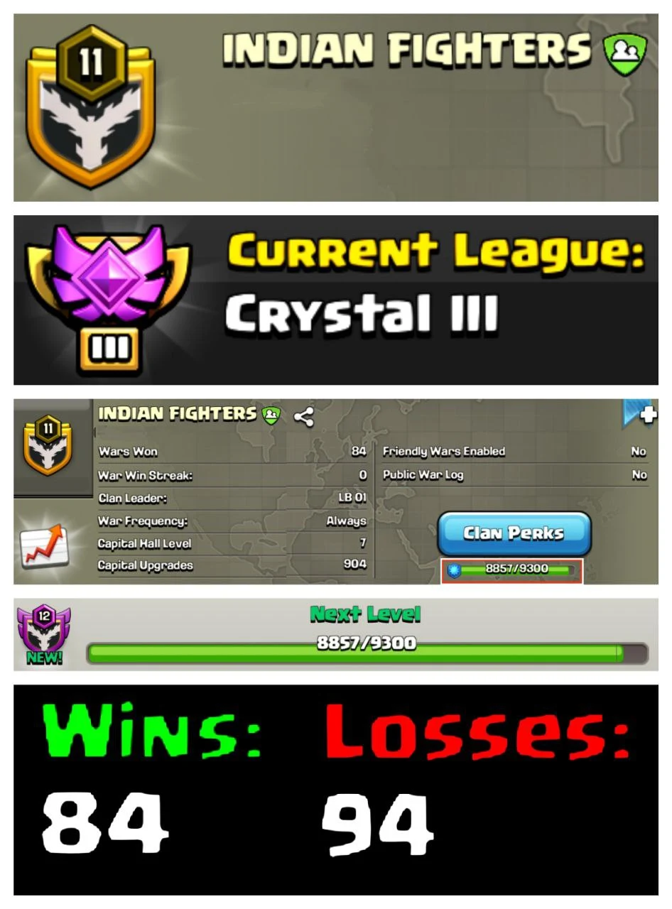 ❤🔥OP LEVEL 11 ENGLISH CLAN ✨ OP NAME : INDIAN FIGHTERS💥 LEAUGE : CRYSTAL 3 ♨️ CLAN CAPITAL : 7 🤝 WINS : 84 | LOSS : 94❣️BEST CLAN BUY NOW ⚡ FAST DELIVERY🚚