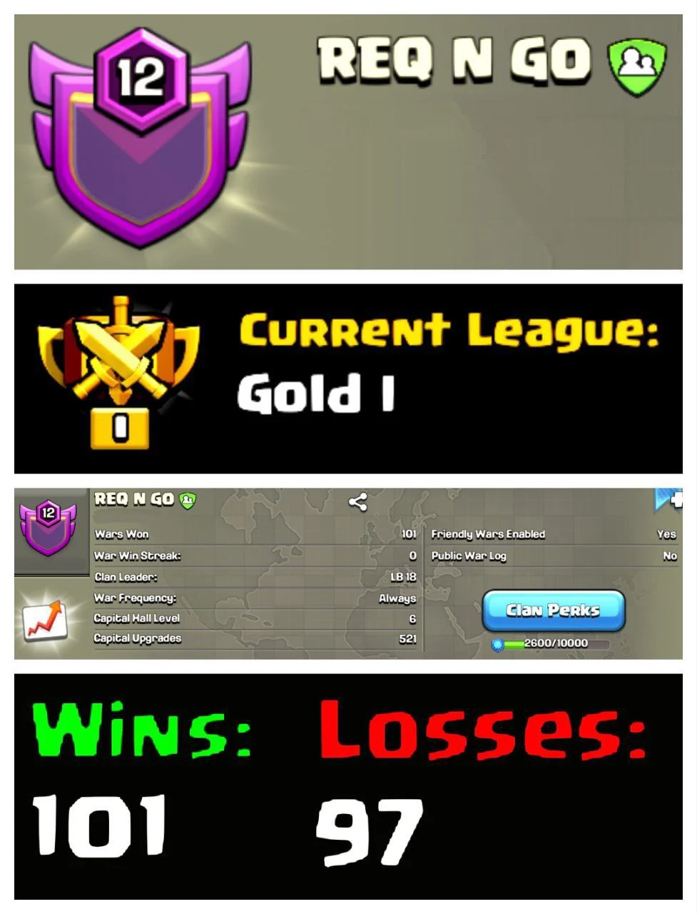 ❤🔥OP LEVEL 12 ENGLISH CLAN 🔥 OP NAME : REQ N GO ⚡LEAGUE : GOLD 1🔅 CLAN CAPITAL : 6🍁WINS : 101 | LOSS : 97❄BEST CLAN BUY NOW ❤🔥 FAST DELIVERY🚚