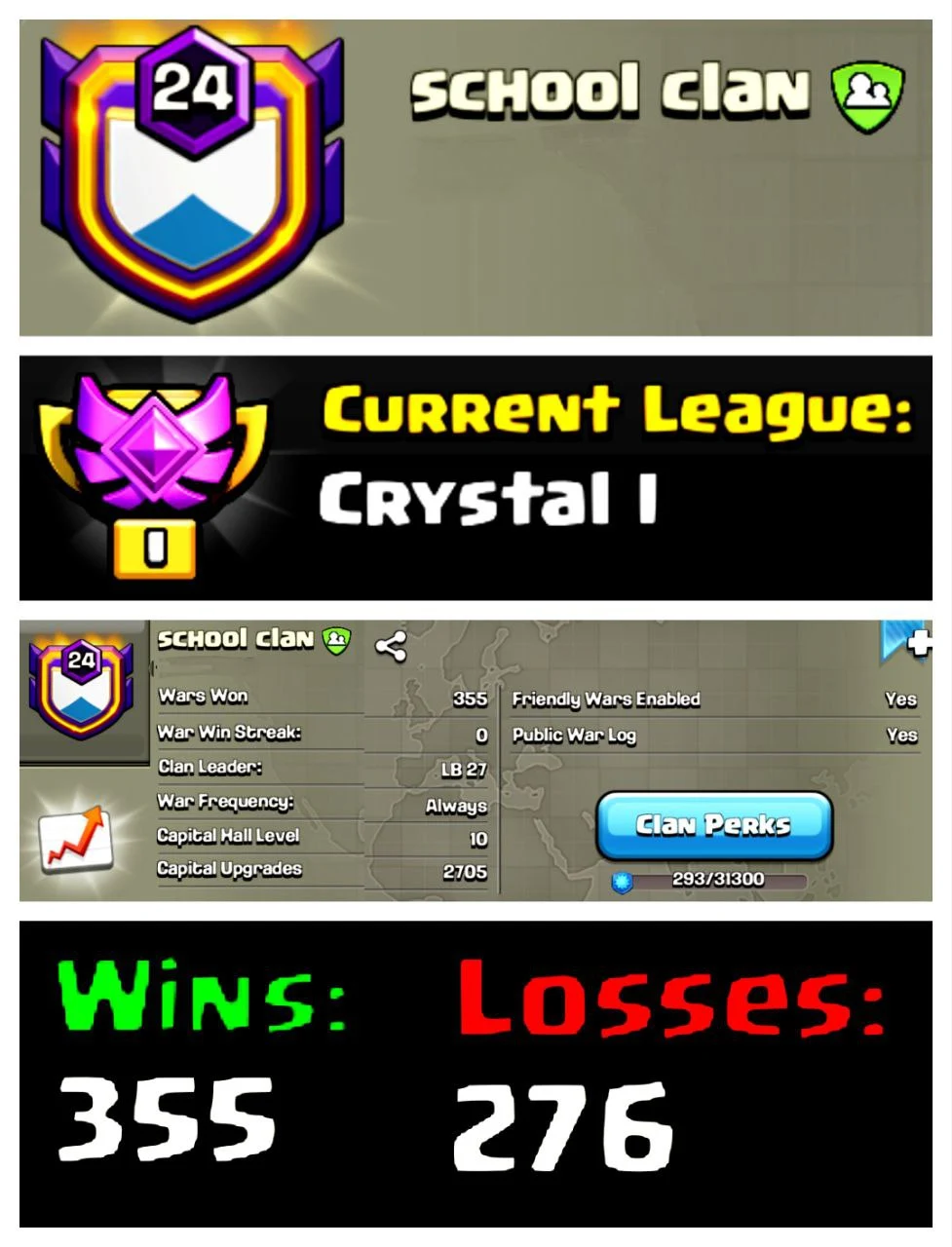 ❤🔥OP LEVEL 24 ENGLISH CLAN 💥 OP NAME : SCHOOL CLAN☘LEAGUE : CRYSTAL 1🌲 CLAN CAPITAL : 10 🌙WINS : 355 | LOSS : 276💫 BEST CLAN BUY NOW ☃️ FAST DELIVERY🚚