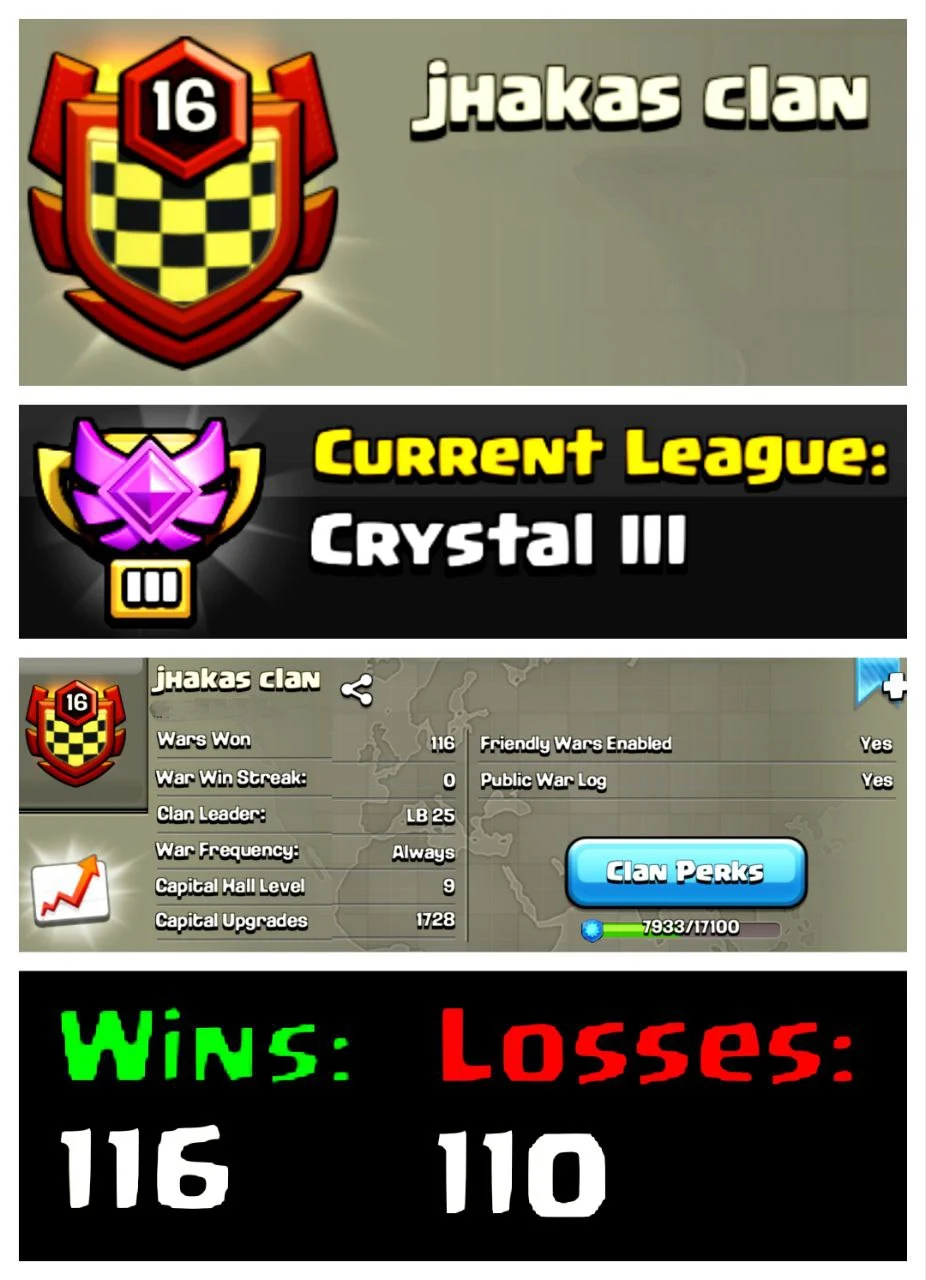 ✔️OP LEVEL 16 ENGLISH CLAN ♣️ OP NAME : JHAKAS CLAN ❤️🔥LEAGUE : CRISTAL 3♻️ CLAN CAPITAL : 9✴️WINS : 116| LOSS : 110♠️ BEST CLAN BUY NOW 🛑FAST DELIVERY🚚