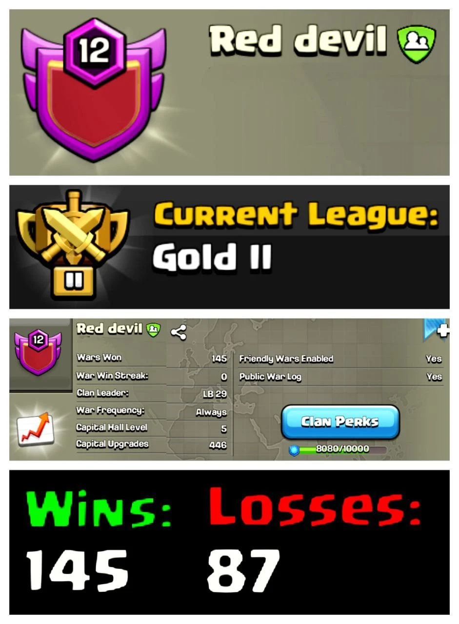 ✔️OP LEVEL 12 ENGLISH CLAN ♣️ OP NAME : RED DEVIL❤️🔥LEAGUE : GOLD 2♻️ CLAN CAPITAL : 5✴️WINS : 145 | LOSS : 87♠️ BEST CLAN BUY NOW 🛑FAST DELIVERY🚚