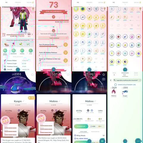 Level 72+;5 legend iv100-Moltres Galar iv100-Kyogre shadow iv100-184 legend-243 shiny-11m+ Stardust-14 Special BG-6 Dynamax-551 coins-114m+ XP
