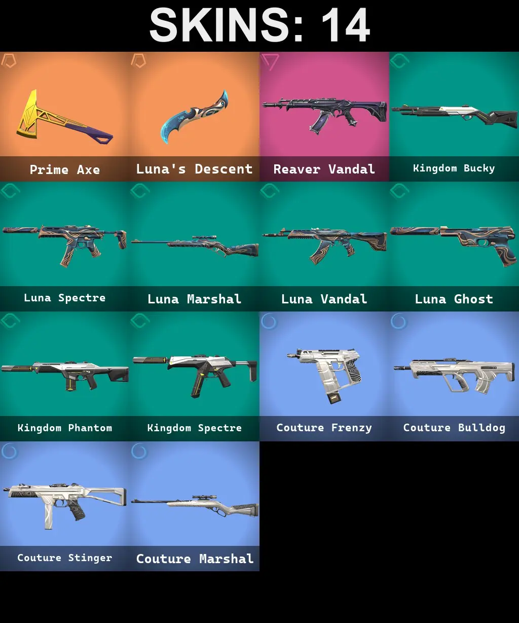 14 SKINS | 2 KNIFE | REAVER VANDAL | PRIME AXE | LUNA'S DESCENT | KINGDOM BUCKY | LUNA SPECTRE | LUNA MARSHAL | LUNA VANDAL | LUNA GHOST | KINGDOM PHANTOM | KINGDOM SPECTRE | COUTURE FRENZY | COUTURE BULLDOG | COUTURE STINGER | CO