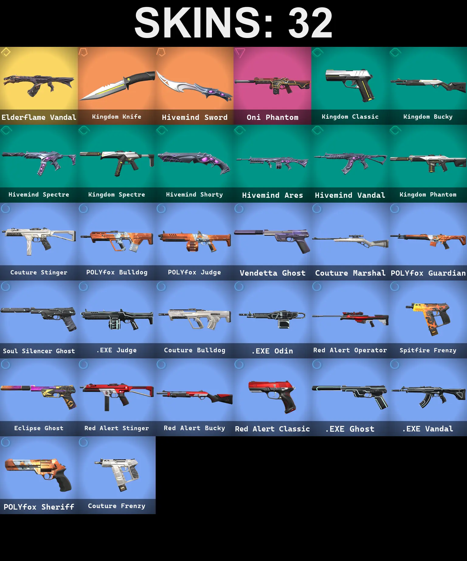 ❤️ 32 SKINS ❤️ 2 KNIFE ❤️ ELDERFLAME VANDAL ❤️ ONI PHANTOM ❤️ KINGDOM KNIFE ❤️ HIVEMIND SWORD ❤️ KINGDOM CLASSIC ❤️ KINGDOM BUCKY ❤️ HIVEMIND SPECTRE ❤️ KINGDOM SPECTRE ❤️ HIVEMIND SHORTY ❤️ HIVEMIND ARES ❤️ HIVEMIND VANDAL ❤️