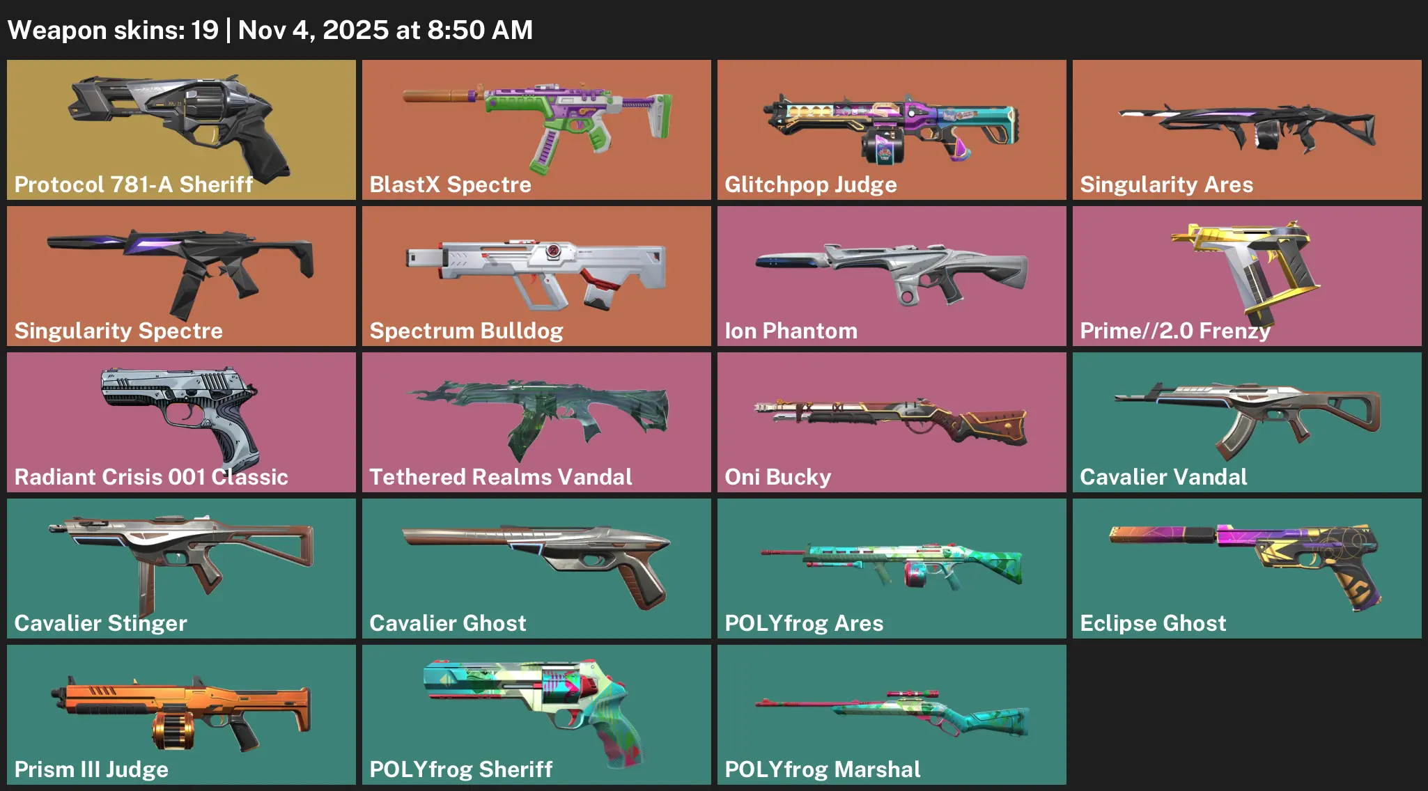 🌛 AP 🪛 Unranked 🥰 19 Skins 🏑 1725 VP 🍥 11 Agents 👺 Value: 22725 VP 🏡 Protocol 781-A Sheriff 🏪 BlastX Spectre 🦗 Glitchpop Judge 🔎 Singularity Ares 📼 Singularity Spectre 🩰 Spectrum Bulldog