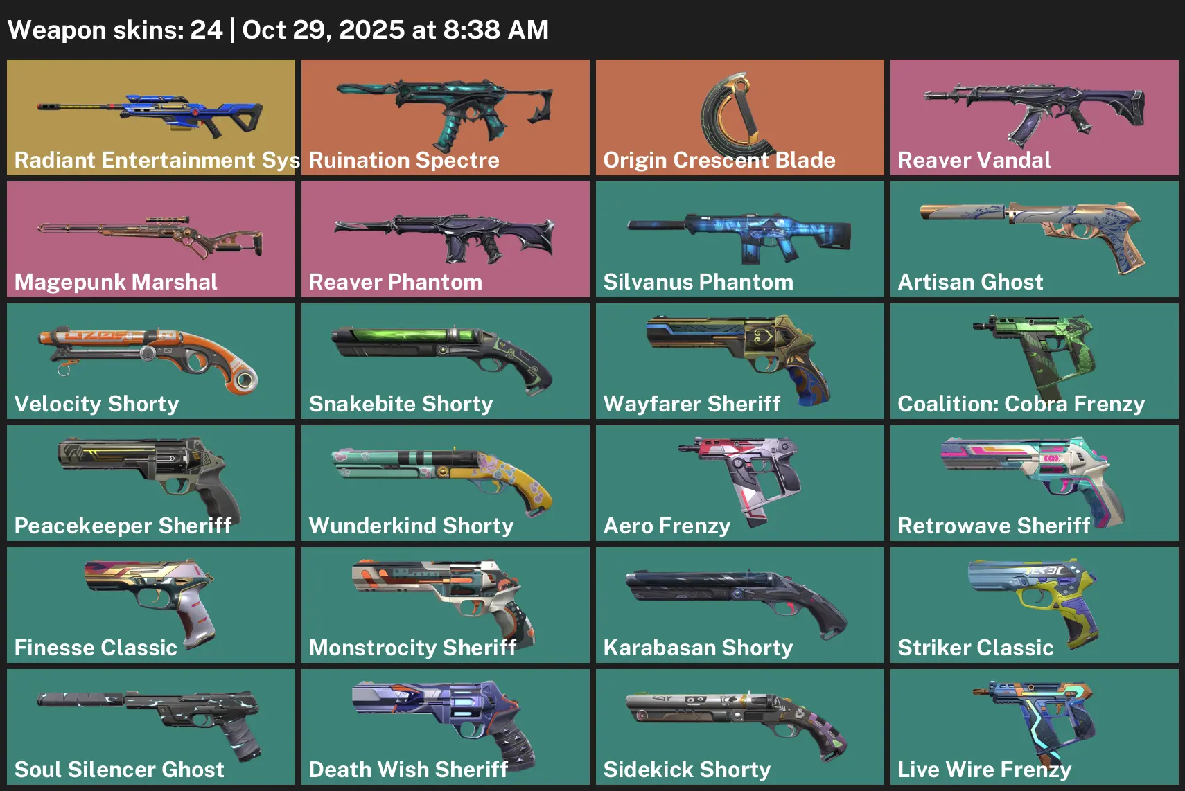 🤼♂️ AP 🐕 Unranked 😢 24 Skins 👍 308 VP 🔨 19 Agents ✂️ Value: 15300 VP 🚴 Radiant Entertainment System Operator 📧 Ruination Spectre 🎈 Origin Crescent Blade 🔋 Reaver Vandal 🥅 Magepunk Marshal 🐓 Reaver Phantom