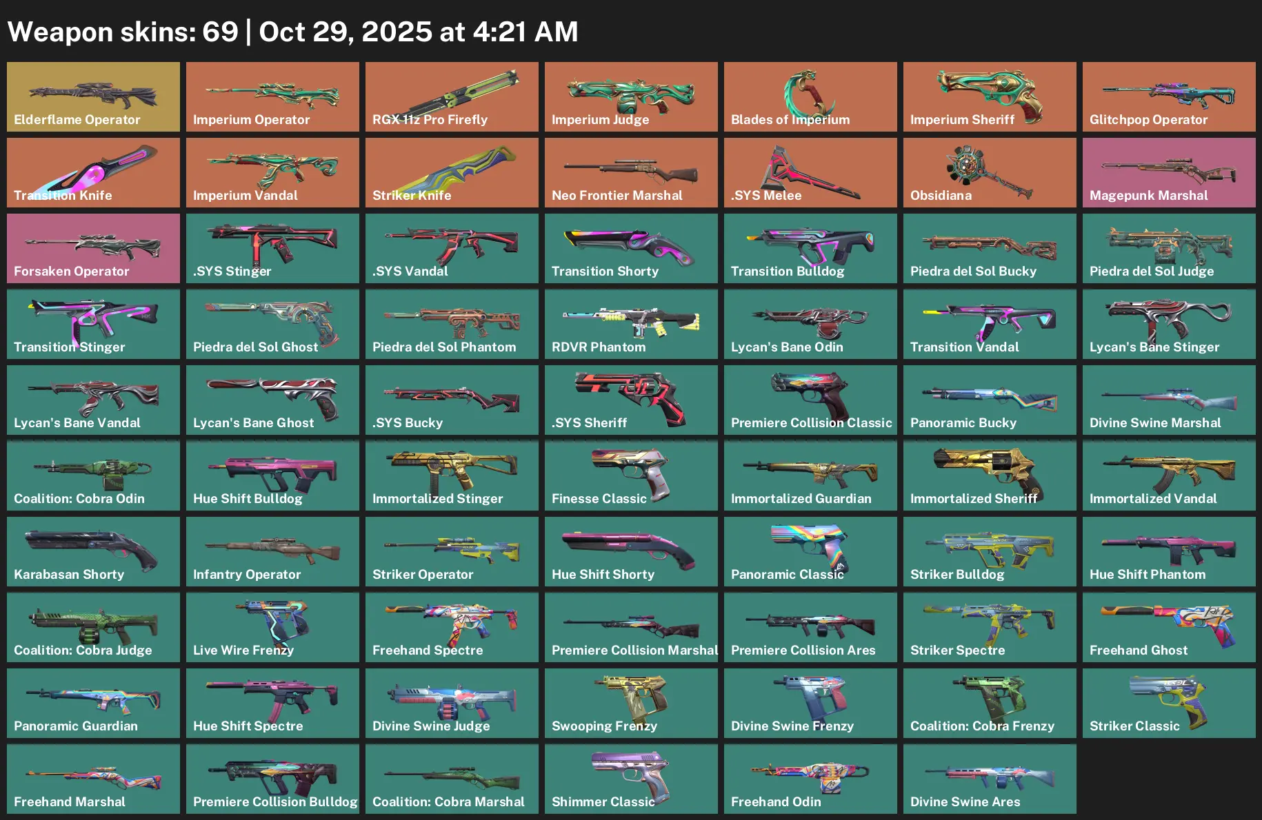 👇 AP 🖲 Unranked 🥳 69 Skins 🚜 125 VP 🐒 19 Agents ⛳️ Value: 28650 VP 🧄 Elderflame Operator 🤗 Imperium Operator 🐚 RGX 11z Pro Firefly 🥸 Imperium Judge ⛓ Blades of Imperium 🍃 Imperium Sheriff