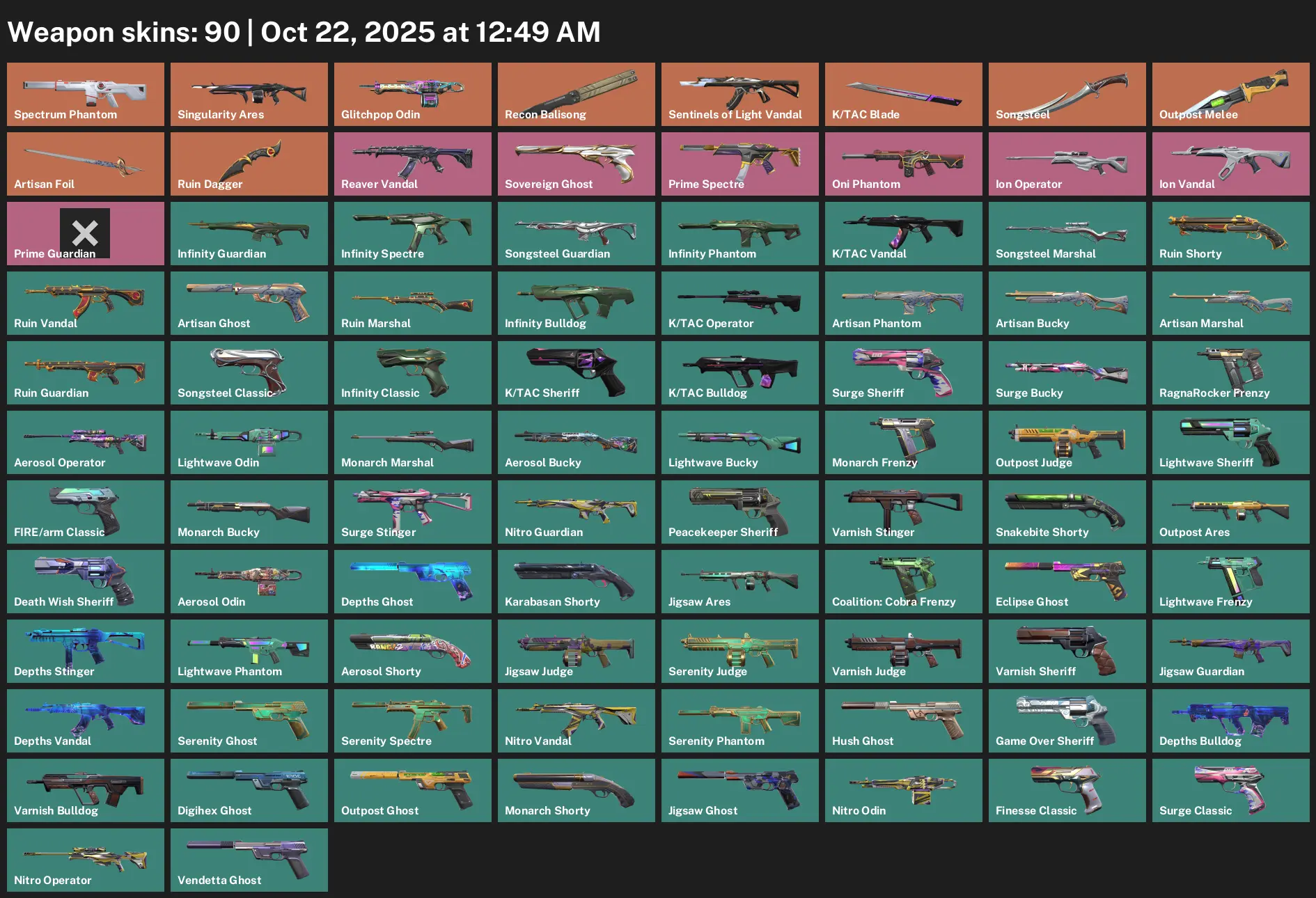 ⛓️💥 AP 🤞 Unranked 🌺 90 Skins 🛀 433 VP 🛷 19 Agents 🕌 Value: 25175 VP 🌙 Spectrum Phantom 💿 Singularity Ares 🦎 Glitchpop Odin 🪲 Recon Balisong 🐛 Sentinels of Light Vandal 🥕 K/TAC Blade