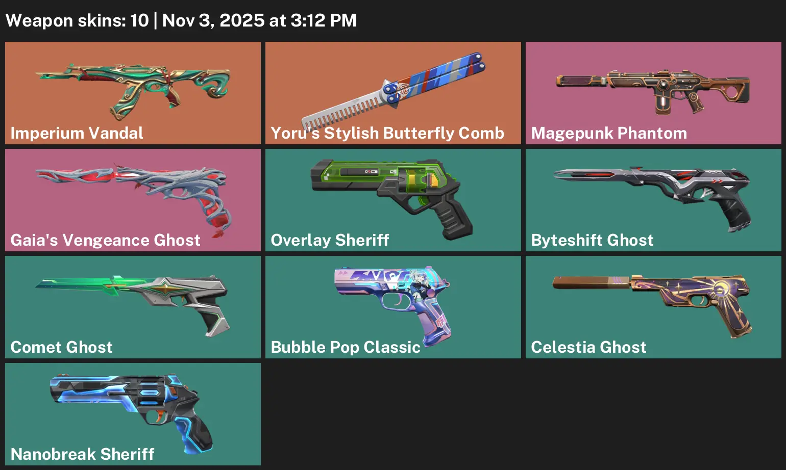 🤬 BR 🫒 Unranked 🪦 10 Skins 💾 150 VP 🖱 22 Agents 🚇 Value: 9275 VP 🧅 Imperium Vandal 💣 Yoru's Stylish Butterfly Comb 🦈 Magepunk Phantom 😉 Gaia's Vengeance Ghost 🫨 Overlay Sheriff 🚄 Byteshift Ghost