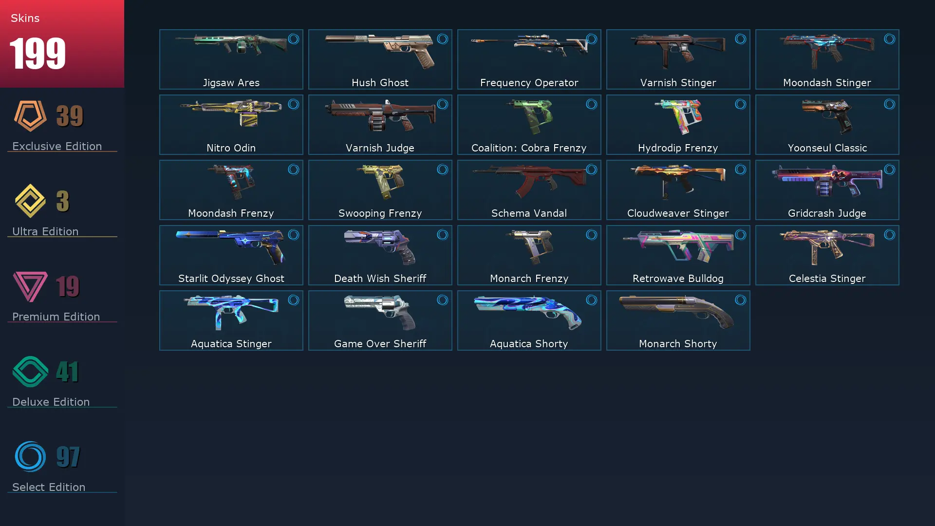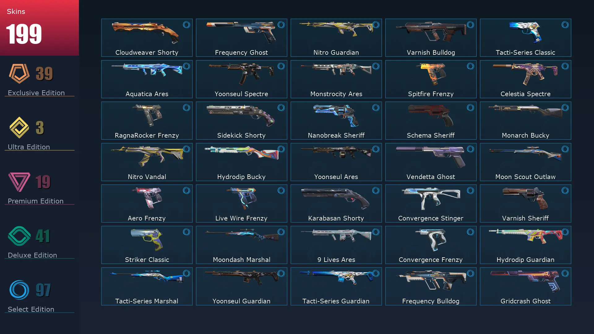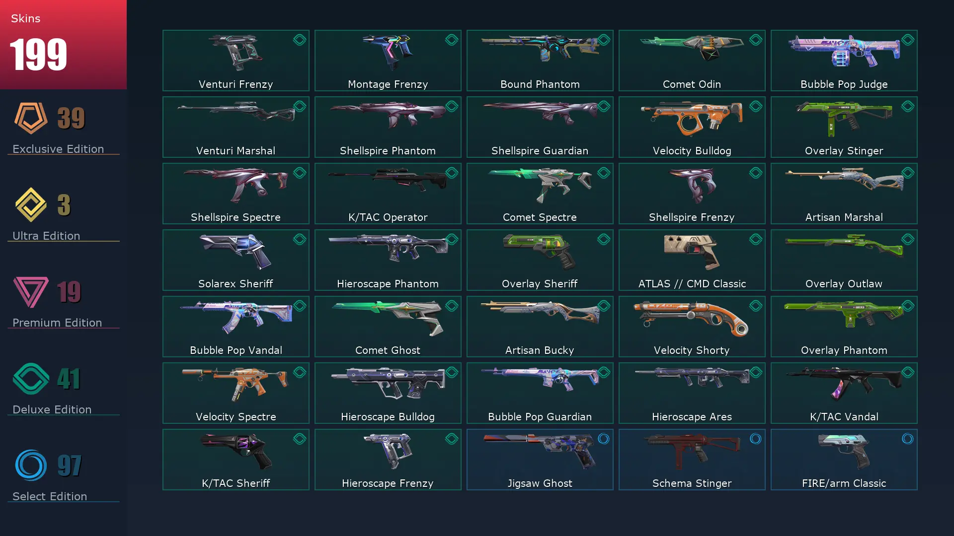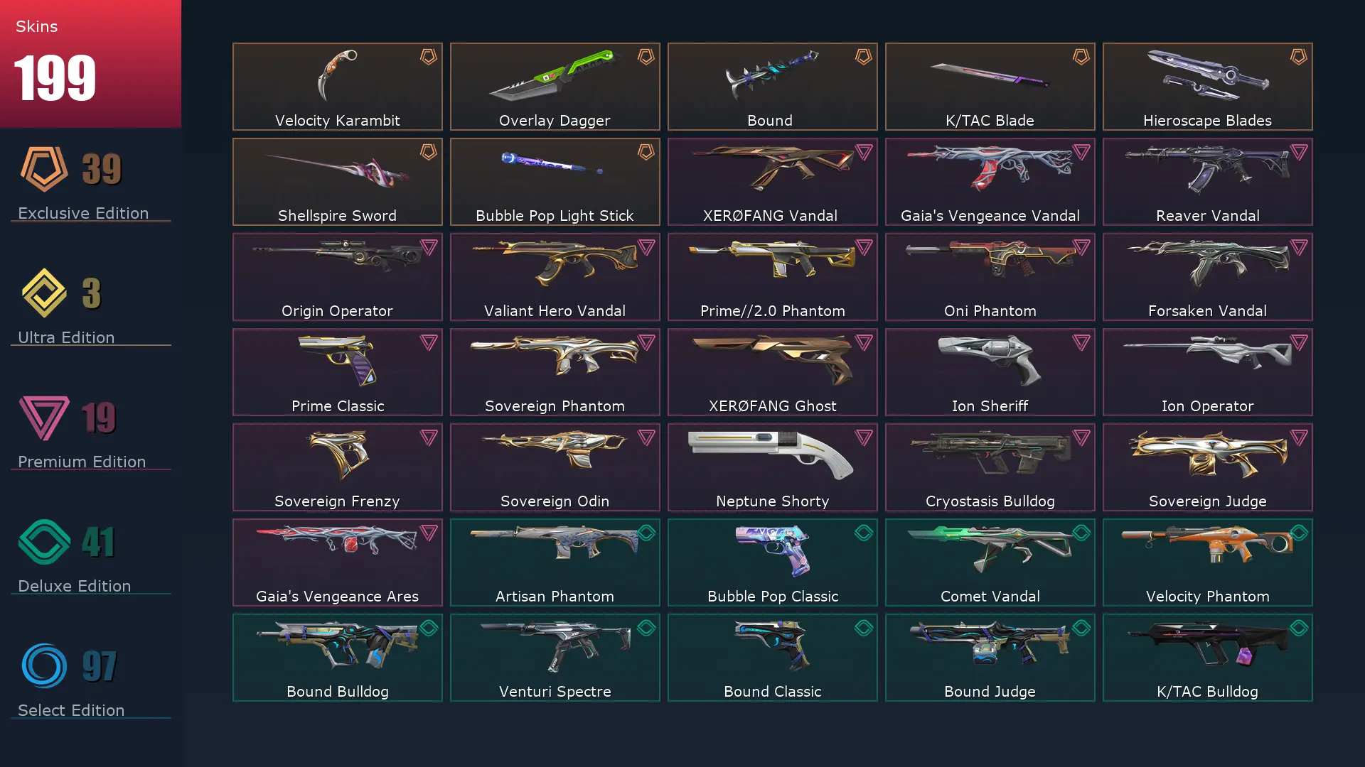 EU 🧋 199 Skins 🦡 Diamond 2 🍲 28 Agents 💣 415 Level 🔥 Arcane Vandal 🤼 Champions 2025 Vandal 🗃 Champions 2024 Phantom 🔫 Champions 2025 Butterfly Knife 📱 Ignite Fan 🌳 Champions 2021 Karambit 🏷 Gaia's Fury 🐥 Forsaken Vandal