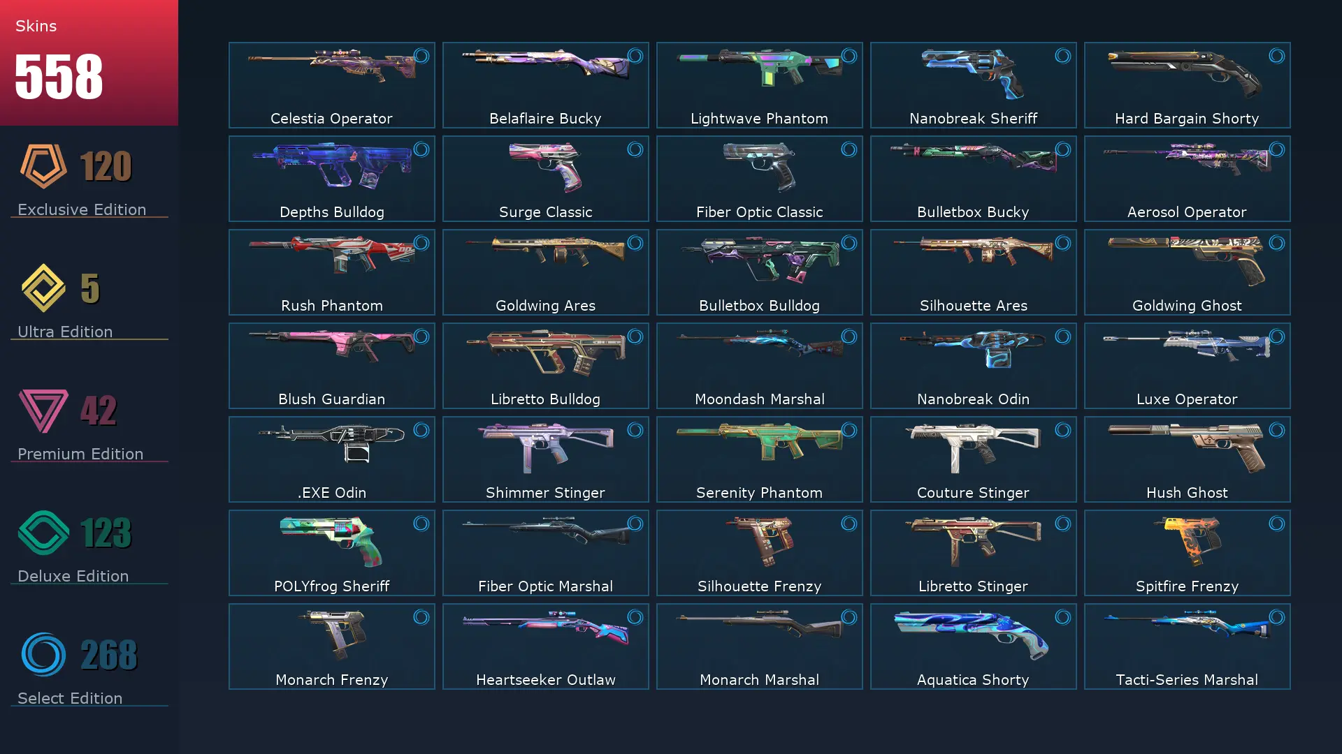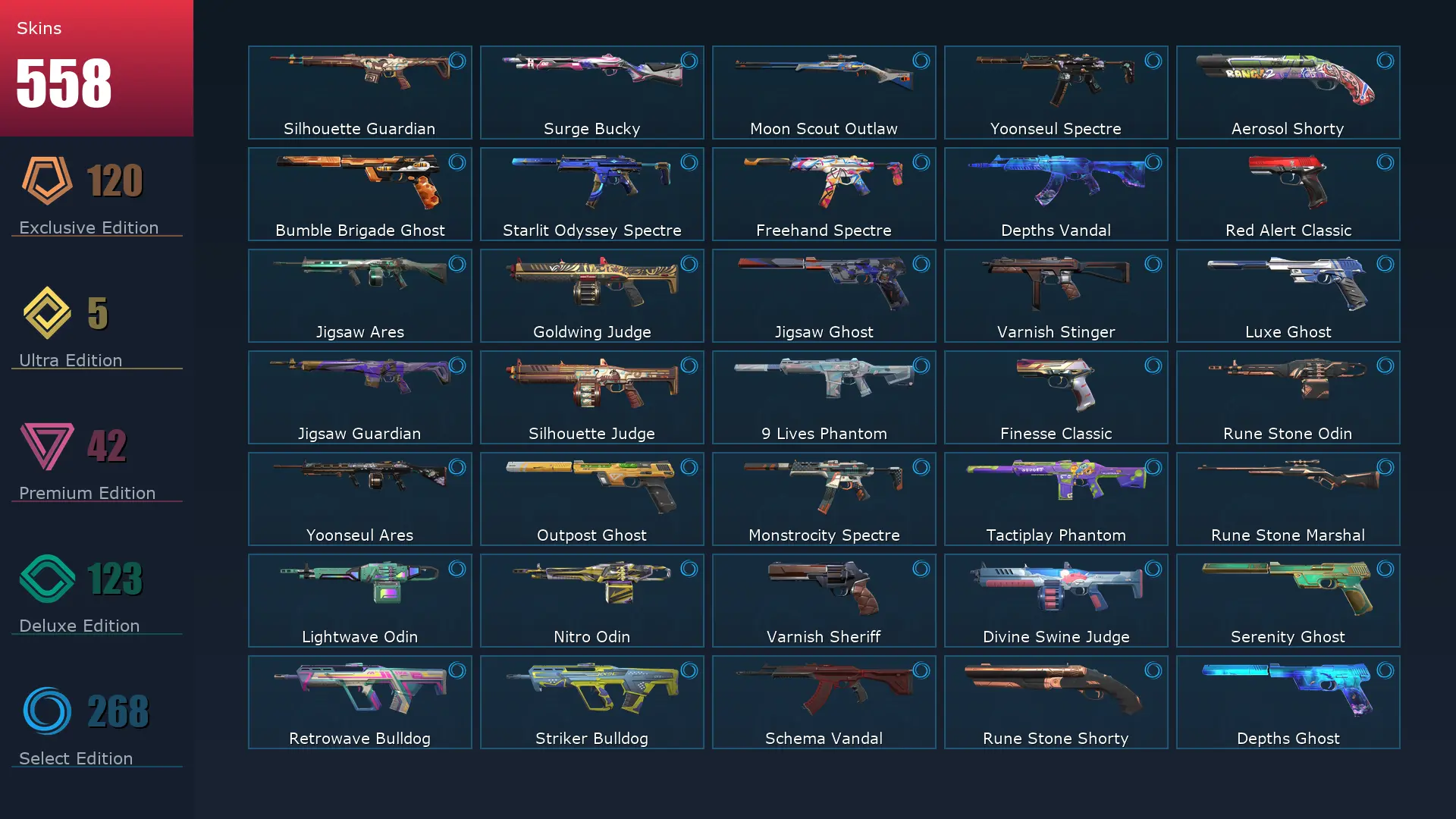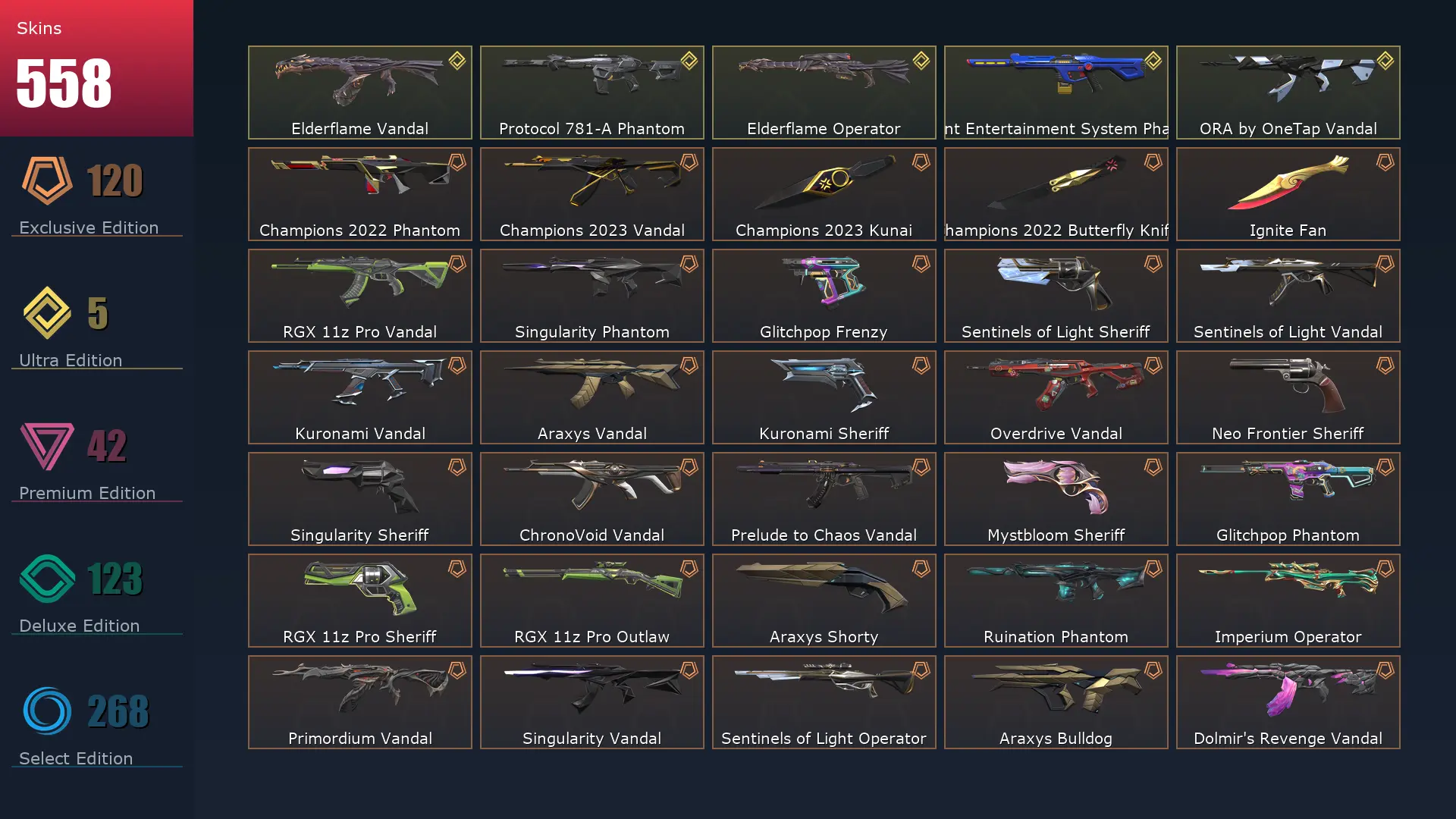 EU 🫧 558 Skins 🧸 28 Agents 🩰 500 Level 🌖 Champions 2022 Phantom 🥿 Champions 2023 Vandal 🌞 Champions 2023 Kunai 🌼 Champions 2022 Butterfly Knife 🏪 Ignite Fan 🐁 Araxys Bio Harvester 🥭 Primordium Vandal 😷 Nocturnum Phantom