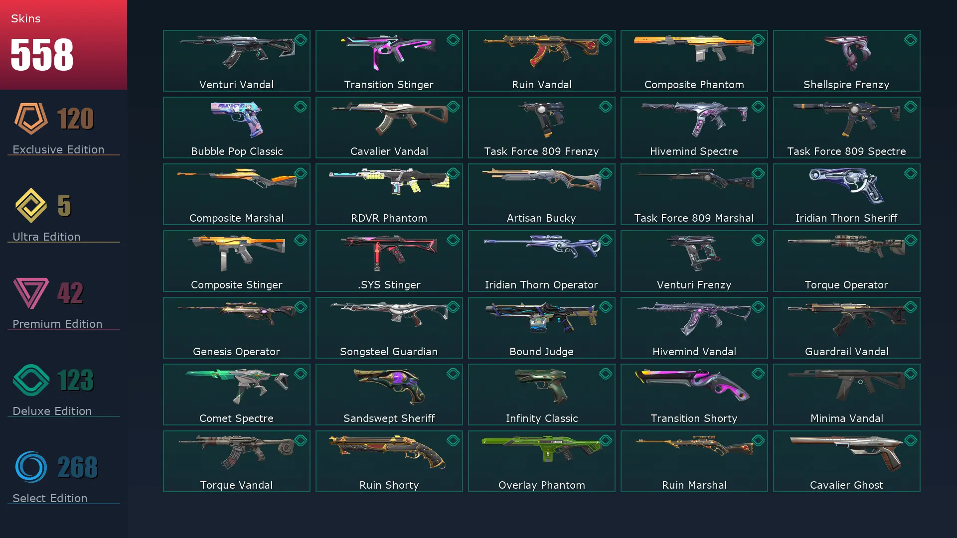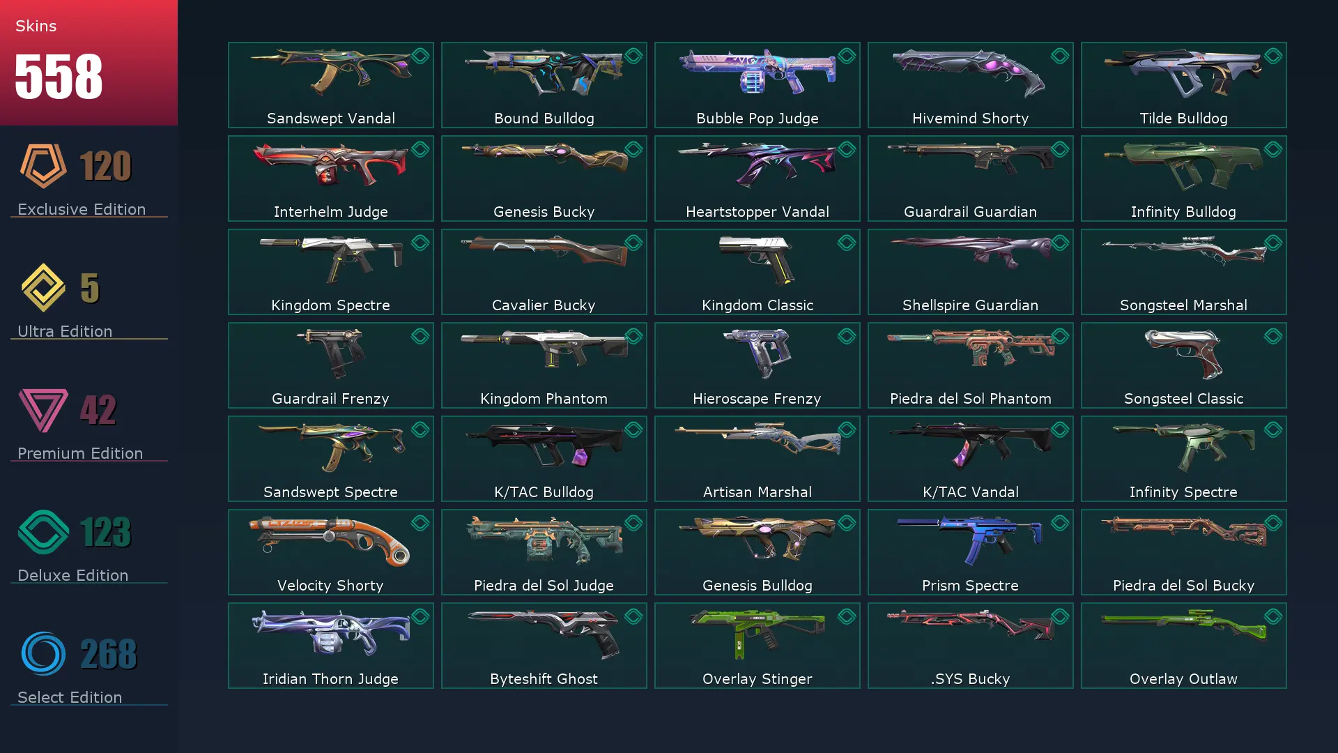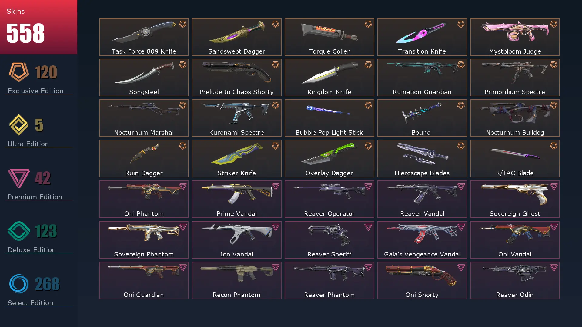 EU 🫧 558 Skins 🧸 28 Agents 🩰 500 Level 🌖 Champions 2022 Phantom 🥿 Champions 2023 Vandal 🌞 Champions 2023 Kunai 🌼 Champions 2022 Butterfly Knife 🏪 Ignite Fan 🐁 Araxys Bio Harvester 🥭 Primordium Vandal 😷 Nocturnum Phantom
