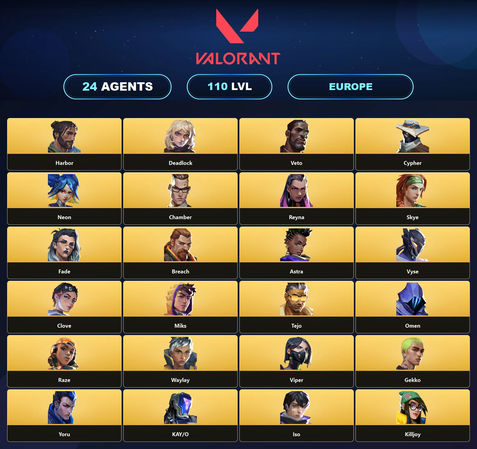 EU โฑ 6 Skins ๐ฅช 110 Level ๐ฏ Kuronami Vandal โ Ion Phantom ๐ Solarex Sheriff ๐ฒ Live Wire Frenzy ๐ ATLAS // CMD Classic ๐ Montage Frenzy ๐ข Platinum 1 ๐ 24 Agents