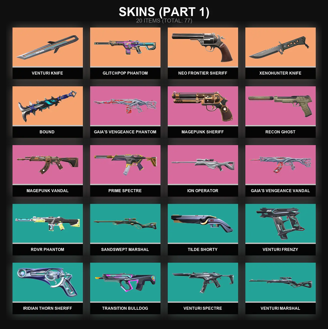 EU | 77 skins 🐓 Xenohunter Knife 🐓 Neo Frontier Sheriff 🐓 Glitchpop Phantom 🐓 Venturi Knife 🐓 Bound 🐓 Gaia's Vengeance Phantom 🐓 Magepunk Vandal 🐓 Ion Operator 🐓 Gaia's Vengeance Vandal 🐓 Recon Ghost 🐓 Prime Spectre 🐓 Magepunk Sheriff 🐓 M3163