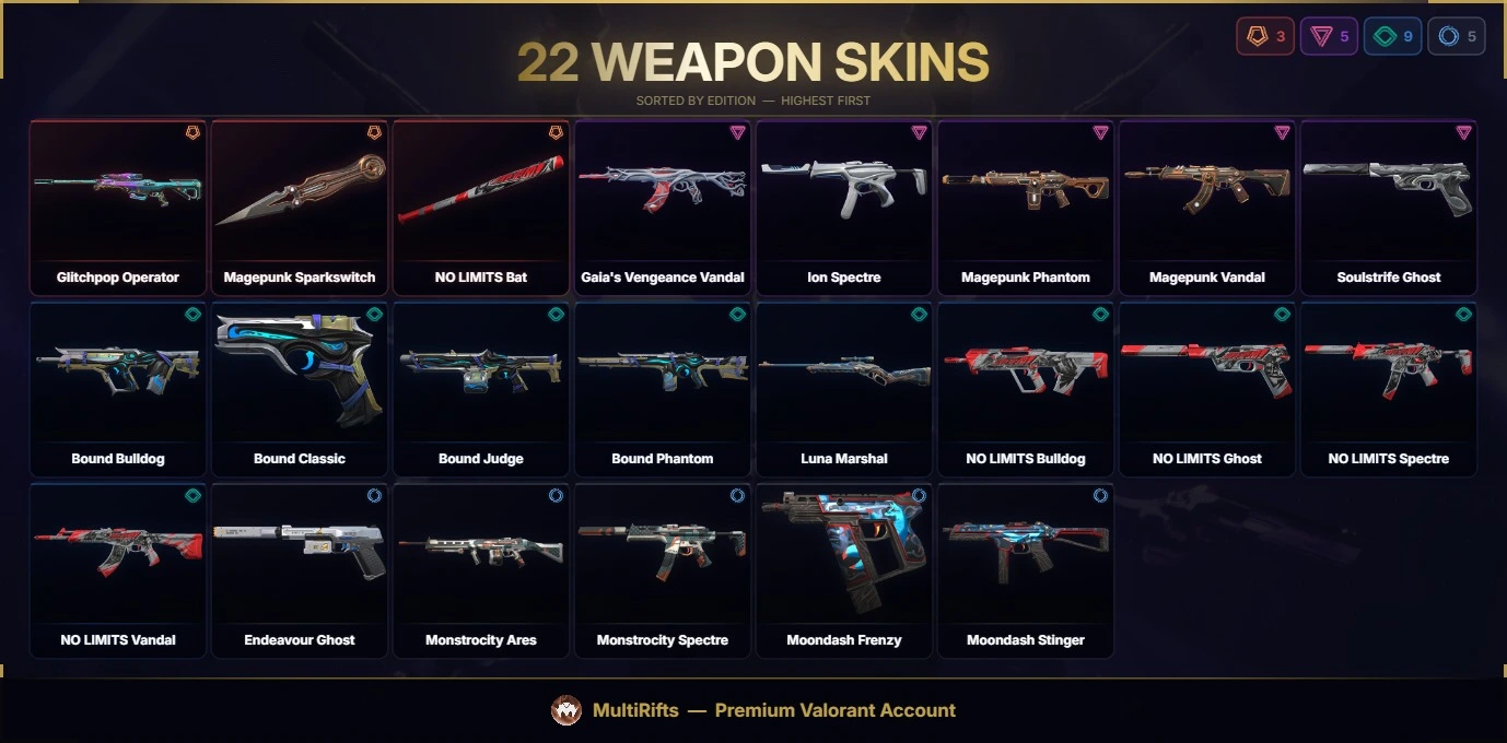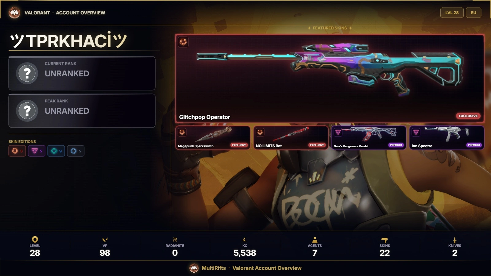 🔫 【EU】 ⸱ 🎯 LVL 28 ⸱ ⚔️ Unranked | 🌈 22 Skins ⸱ [ 🪙 98 VP , 0 RD ] ⸱ 🌟 No Limits Bundle (5) ⸱ Magepunk Bundle (3) ⸱ 🔓 Ready2Smurf 😈