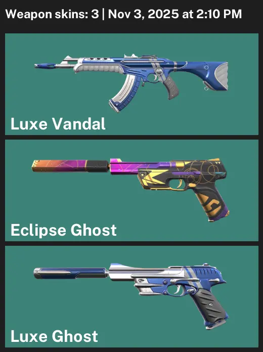 🦗 EU 📁 Unranked 🌯 3 Skins 🥋 0 VP 🕷 12 Agents 🗿 Value: 1750 VP 🛏 Luxe Vandal 📄 Eclipse Ghost 🥏 Luxe Ghost