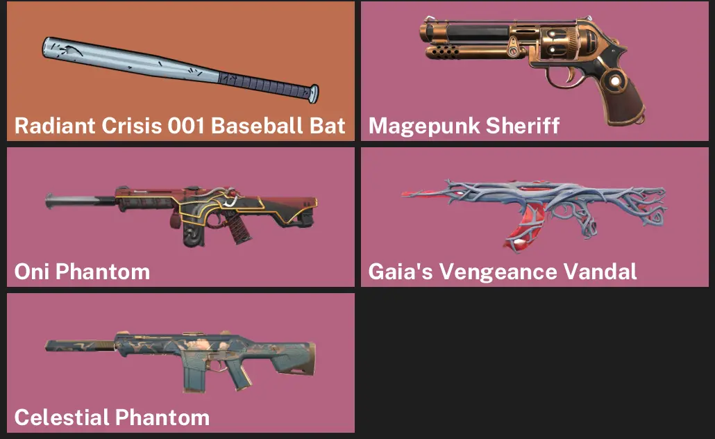 🌍EU 🎮 UNRANKED ✨ Radiant Crisis 001 Baseball Bat ⚙️ Magepunk Sheriff 🐉 Oni Phantom 🌿 Gaia's Vengeance Vandal 🌙 Celestial Phantom