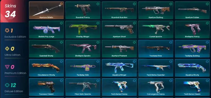 EU / Valorant / 34 Skins / ~ 8,525 VP Spent / Aperture Stiletto mssh912