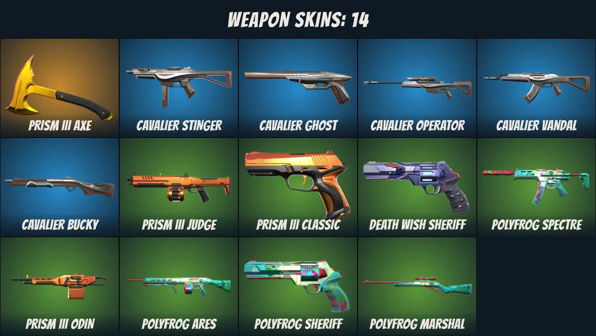 ⚡LA⚡ Unranked 💎 14 Skins 💎 Prism III Axe 💎 Cavalier Stinger 💎 Cavalier Ghost 💎 Cavalier Operator 💎 Cavalier Vandal 💎 Cavalier Bucky 💎 Prism III Judge 💎