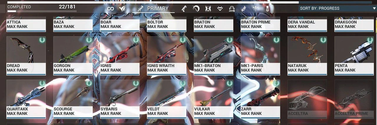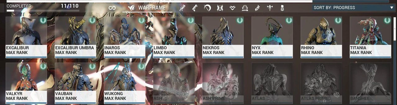 Warframe ⸱ MR 12 ⸱ Legendary 5 ⸱ 11 Frames ⸱ 6 Riven Mods
