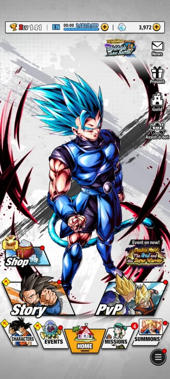 iOS/Android ⚔️ Global 🌐 Level 141💯 Crystal 3972 🏹 Character 288 💎 Super Saiyan & Super Saiyan 2 🎁 Legends 12 🧨 Code1375
