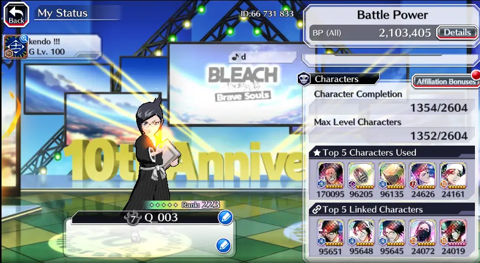 BBS09-4:Rank 223 ⸱ Guild LeveL 100 ⸱ Battle Power 2,103,405 ⸱ Character Completion 1354/2604