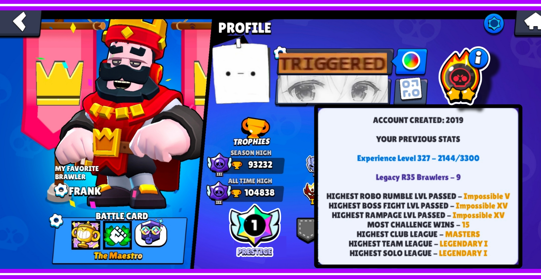 327EXP 🤯 85+ TITLES 🔥 100K+ TROPIES 🏆 ALL HYPER ALL MAXED 🪽 1 PRESTIGE + R35 LEGACY 🔥 70k+ BLING | 130k+ COINS | 200 GEMS ✨ 1000+ PINS | 380+ SKINS 💥 INSTANT DELIVERY ⚡