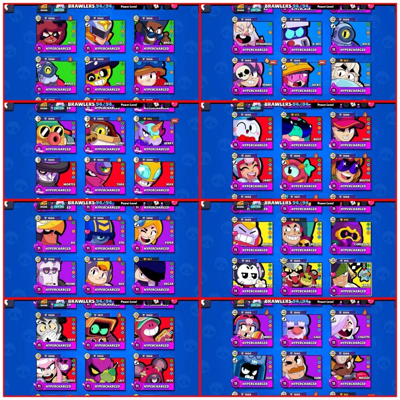 93500+ TROPHIES 💥 HYPNOS SANDY, ONI KENJI, HYERPION COLT 💫 62 MAX POWER BRAWLERS ⭐️ 55 HYPERCHARGED ⚡️ SOLAR FAME 2 🌊 DREAD KNIGHT DRACO, DRIFT EDGAR, MECHA LEON, HADES MORTIS, MECHA COLT ✨ 290 TOTAL SKINS 🥂 25 TITLES 💥 -118 GEMS (NEGATIVE)