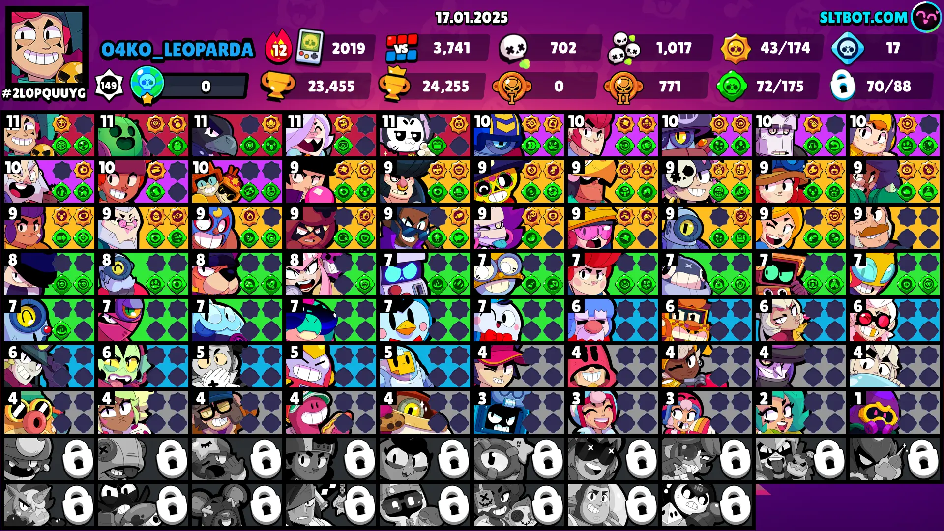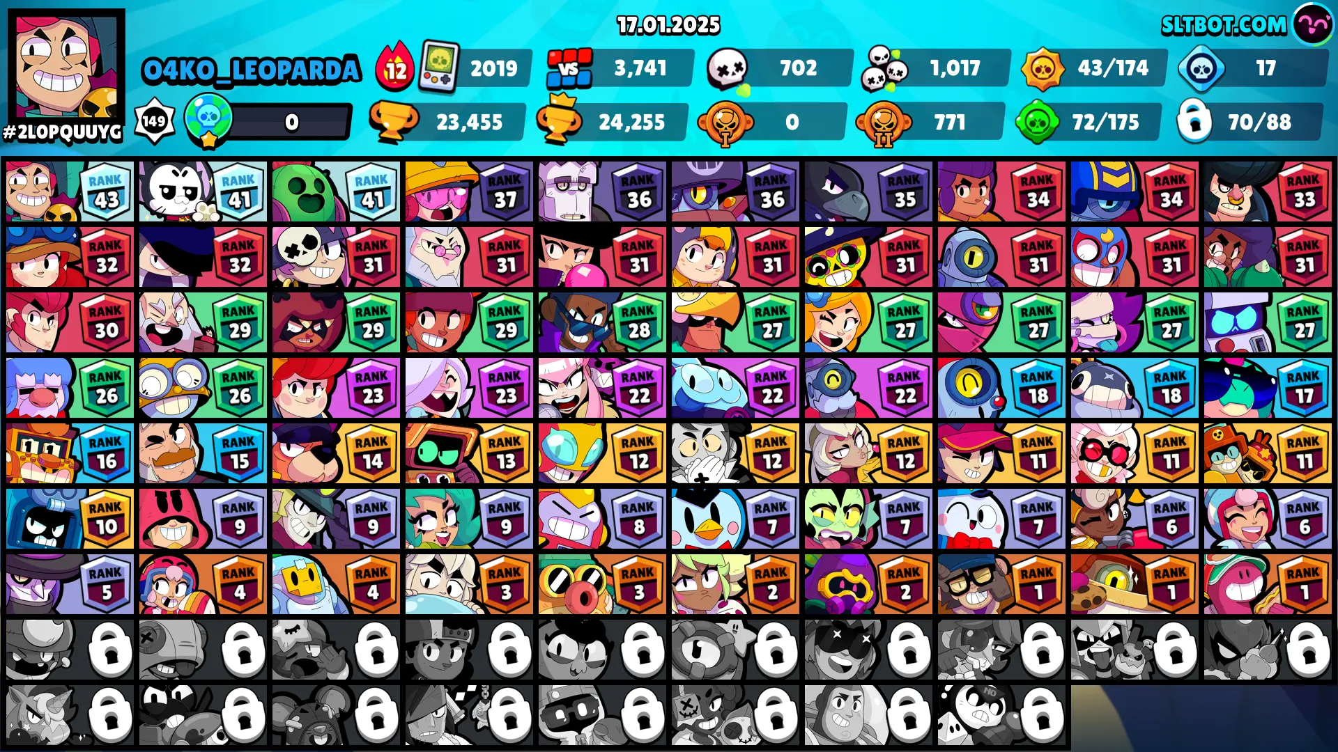 59 SKINS 🩵 23.455 TROPHIES 🏆 70 BRAWLERS 🧸 2 HYPERCHARGED 🩸 3 MAX BRAWLERS 🩷 TANUKI JESSIE 🩵 SHIBA NITA 🩵 SPICY MIKE 🩵 ROSIE CHARLIE 🩵 HOLIDAY PARTY FRANK 🩵 CAT BULGAR JESSIE 🎀