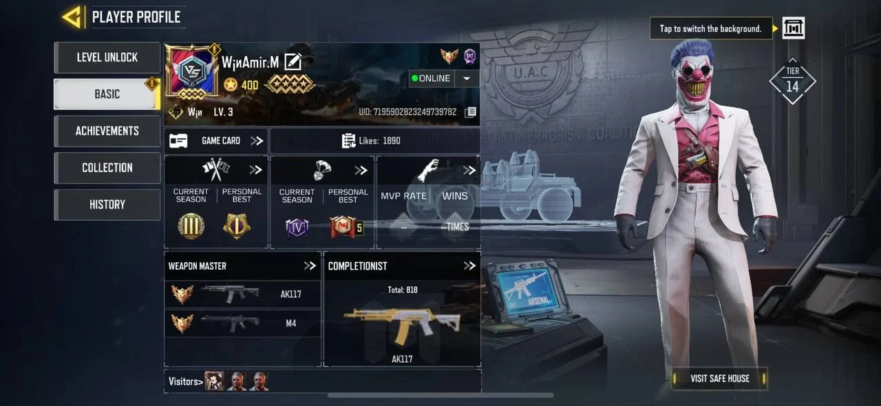 iOS Android 🎮 Level 400 😍 Rank Master 🛍️ 166 Epic 🧩 6 Legendery 🥲 1 Mytich 🌟 62 Epic Soldier 🎯 Code603