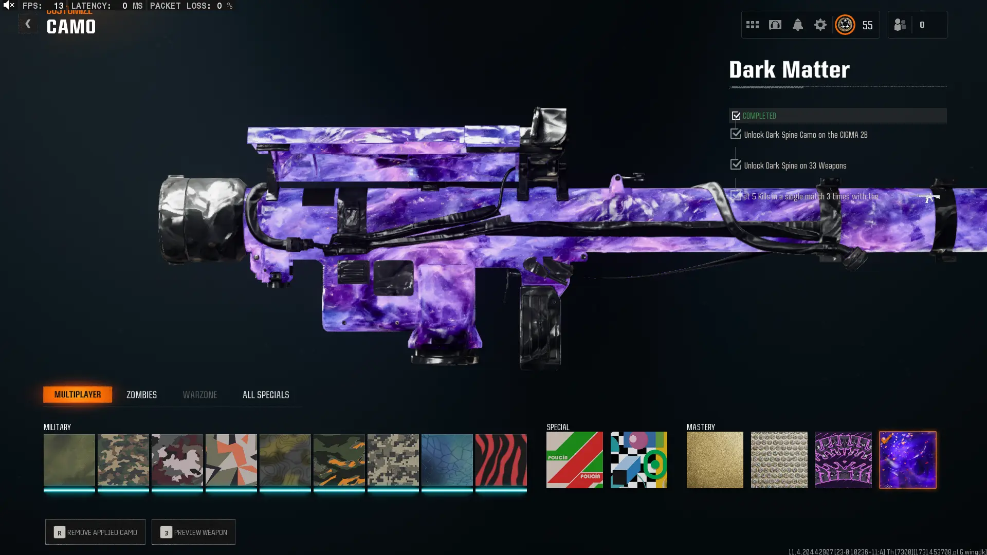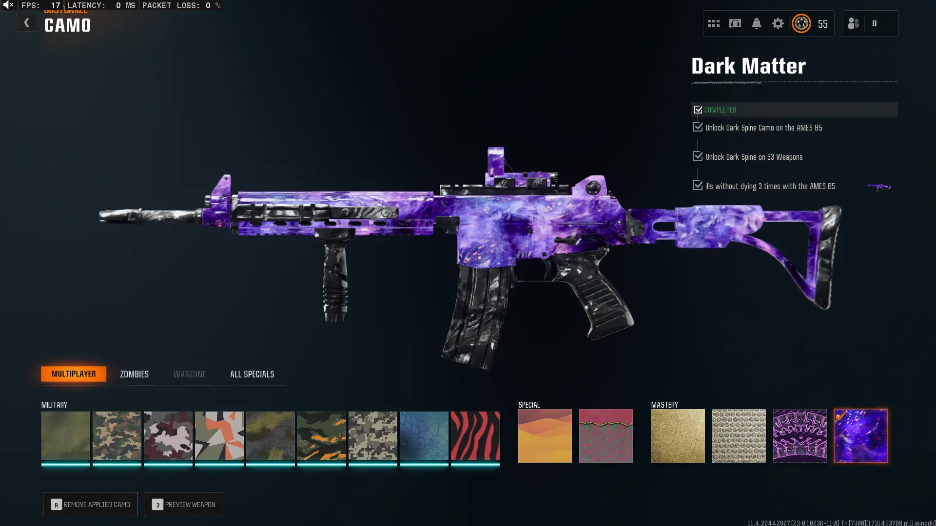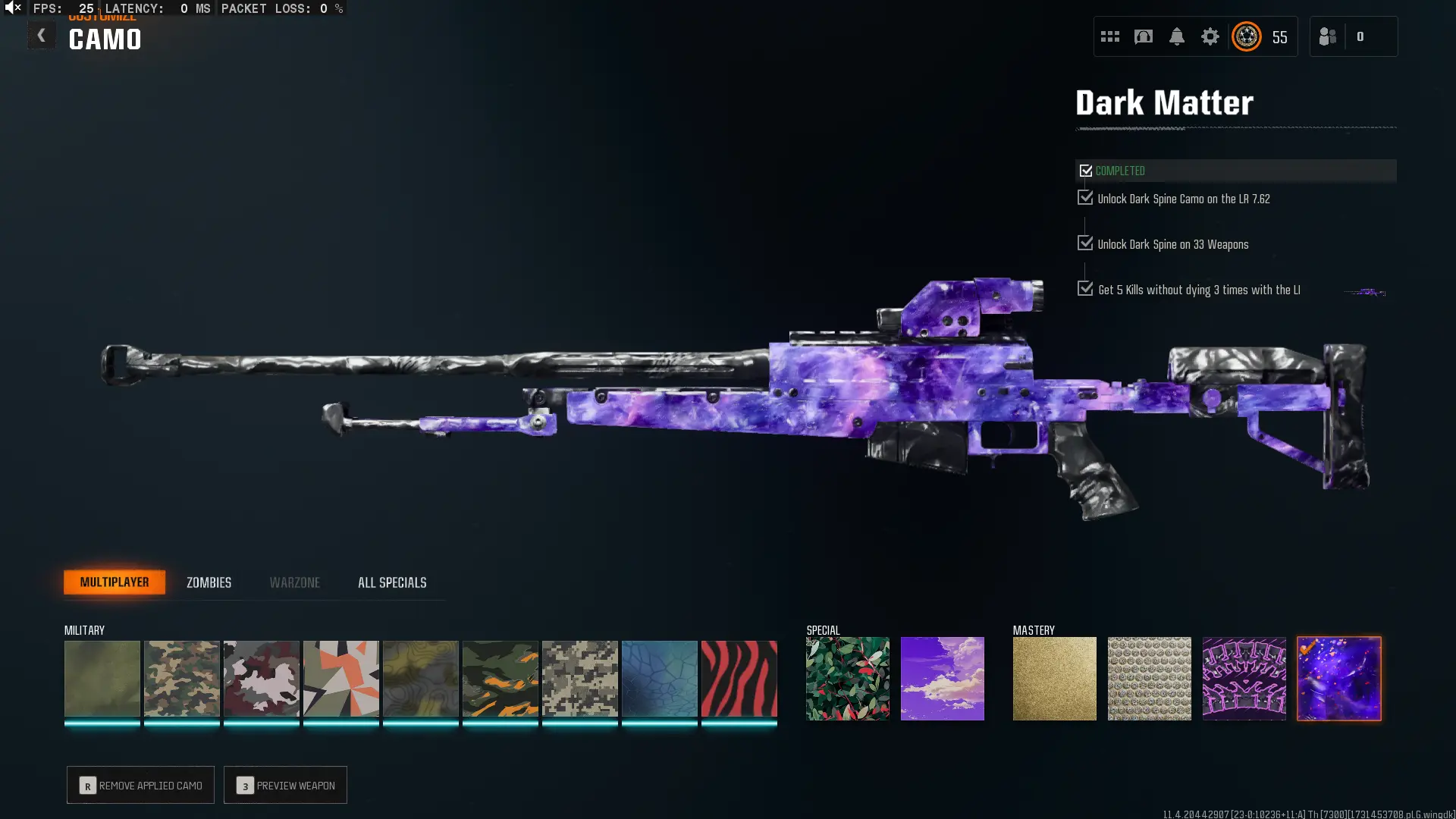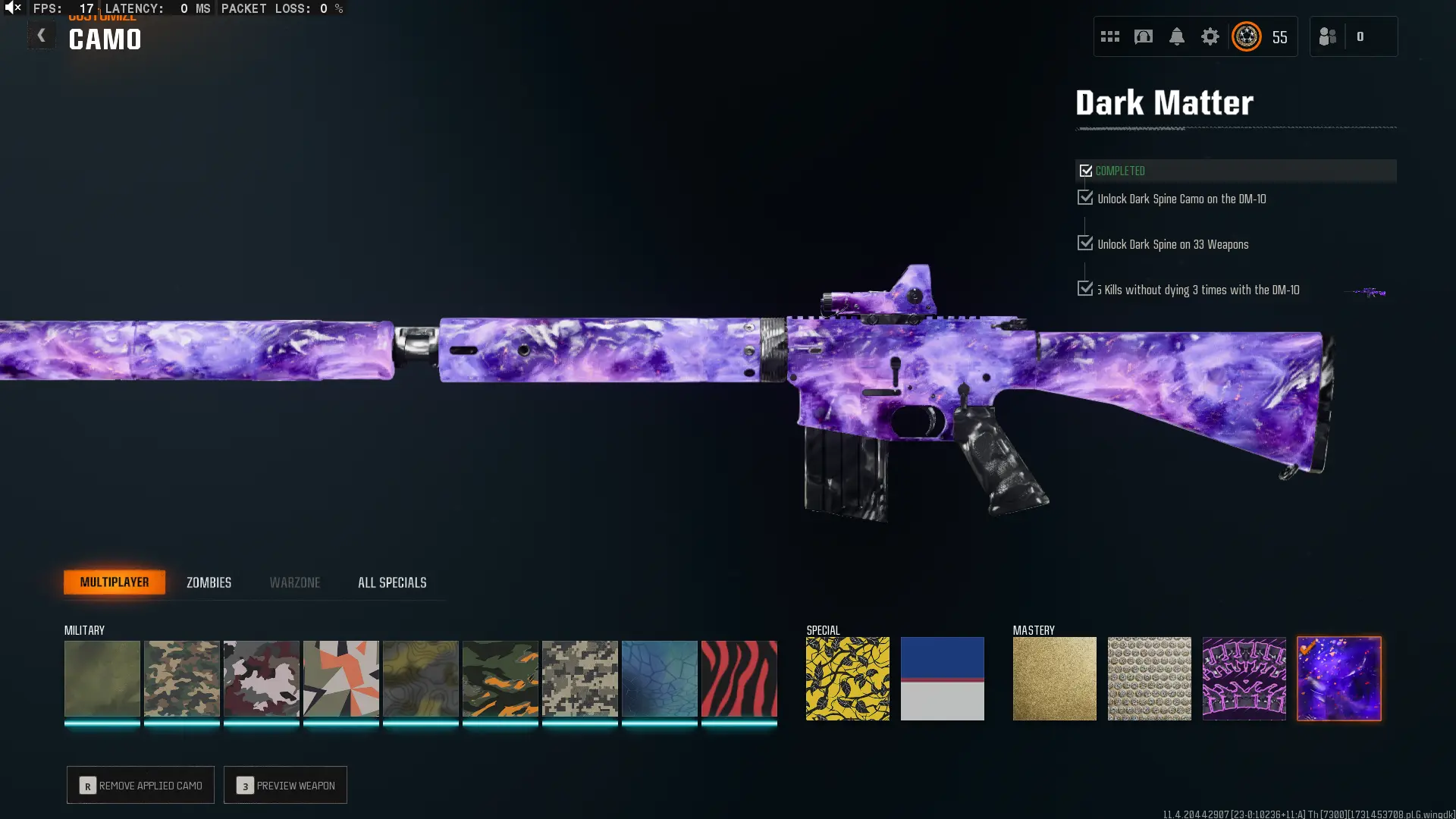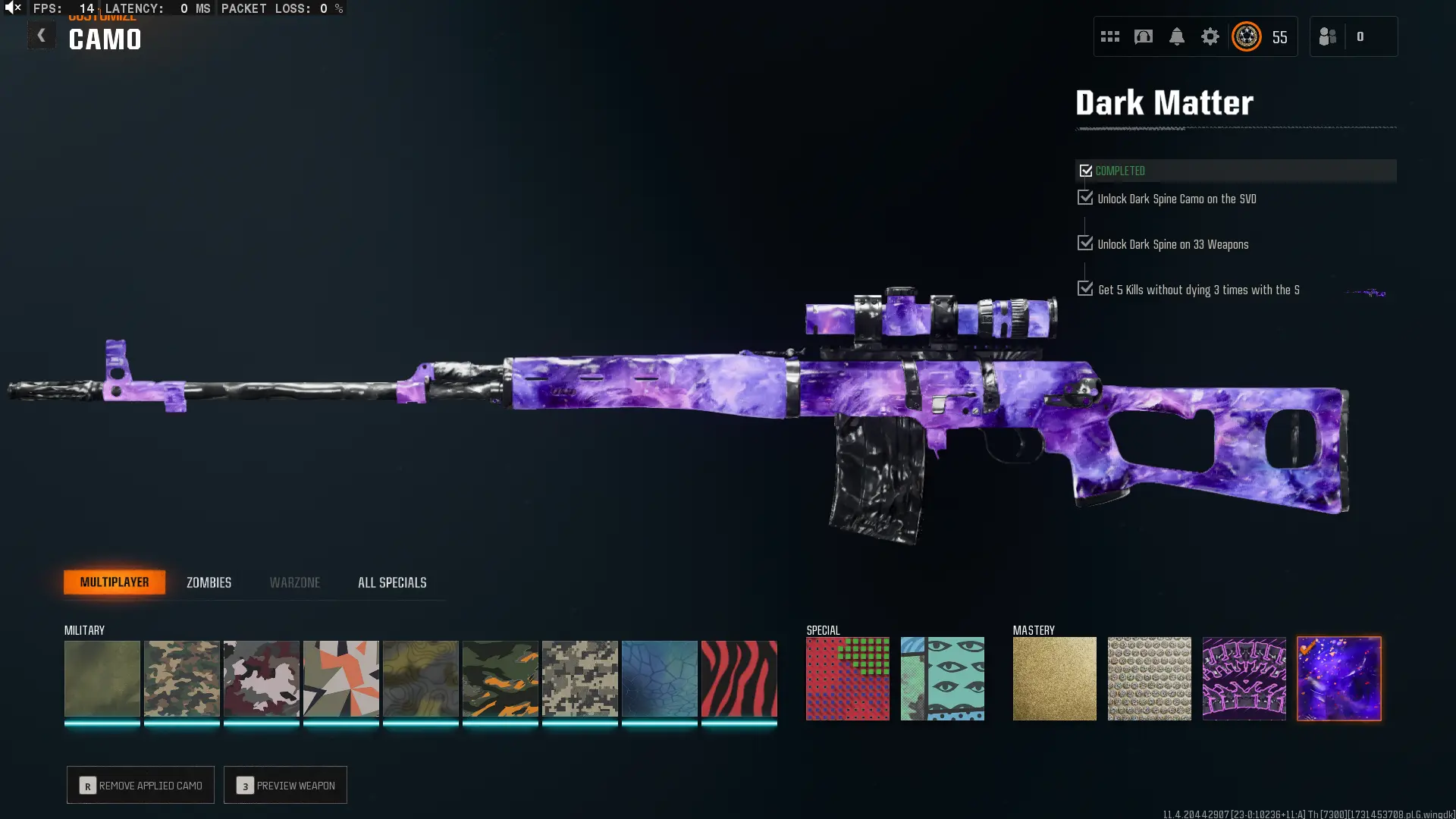 🌌 BO6 & Warzone 🌌 33 Dark Matter 🐉Prestige 4 🌌 459 Camos⚔️ Level 55 🔥 16 Operators 🕸️ Dark Spine 💎 Diamond✨ Gold Camos 🦾 Prestige-Ready🦾 Linkable to: Steam, Battle.net, PSN, Xbox 🌐 Black Ops 6