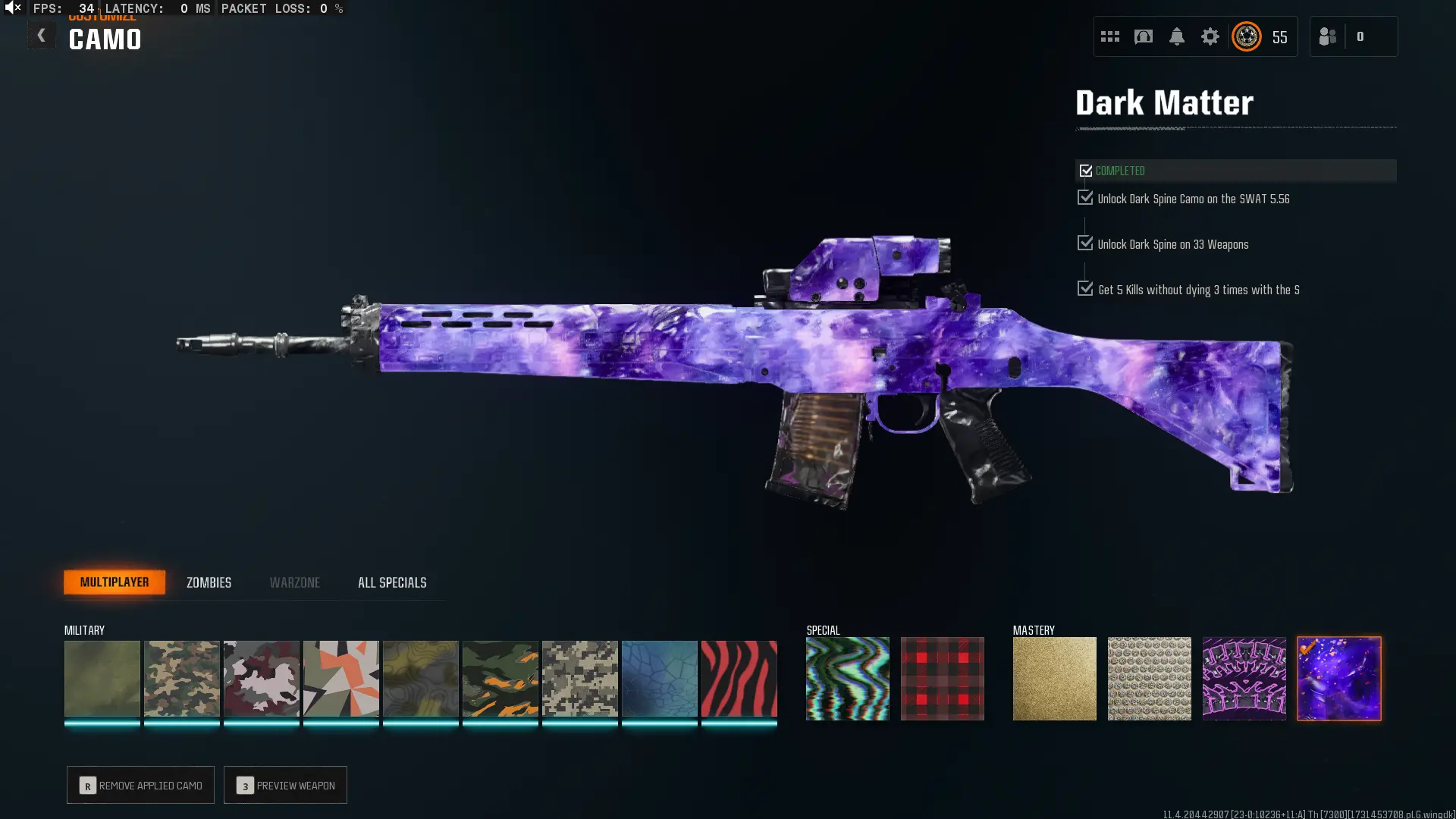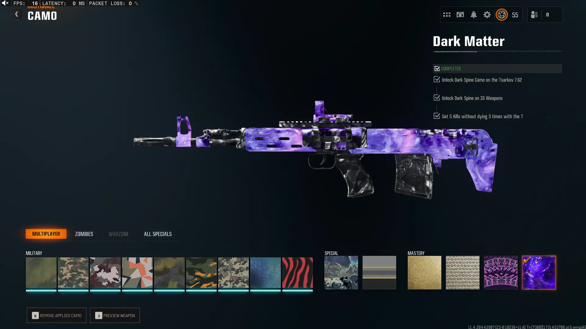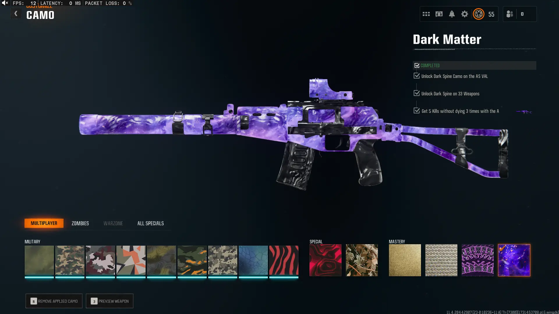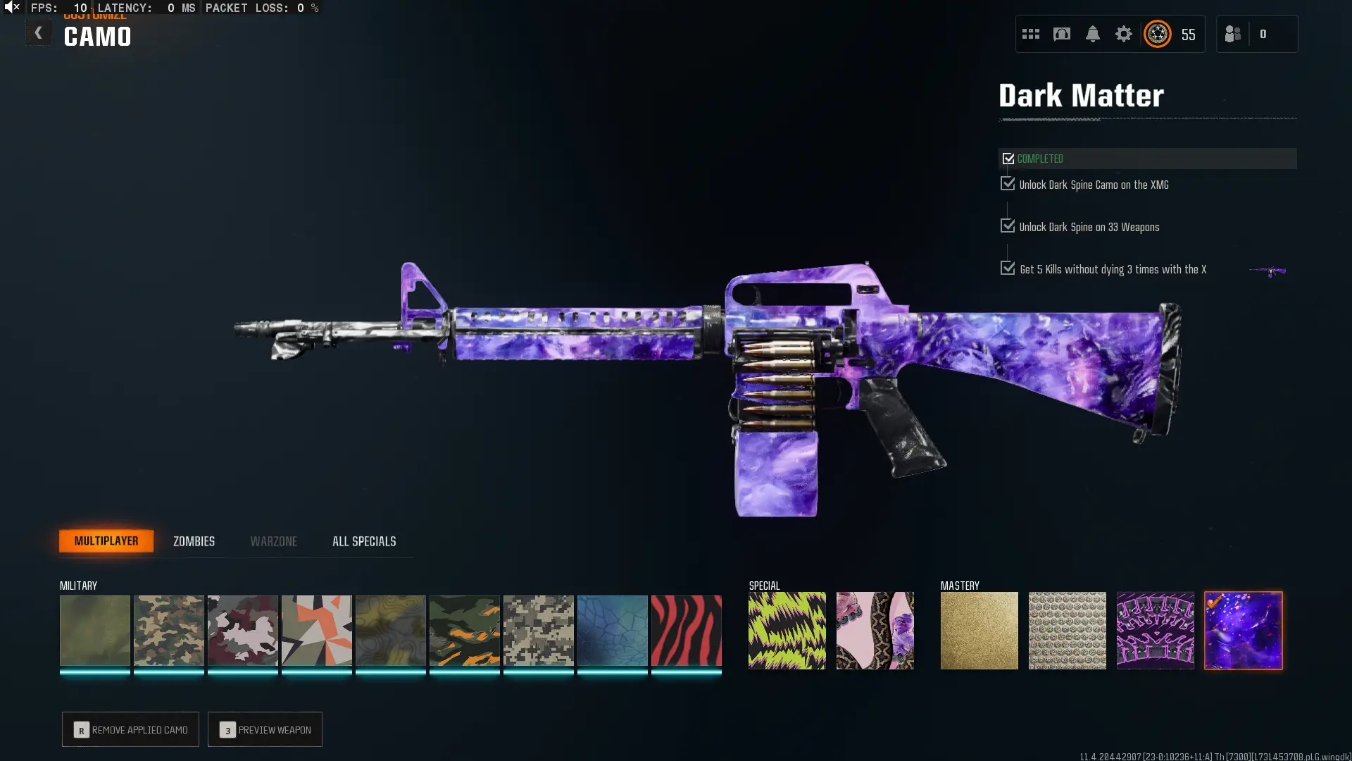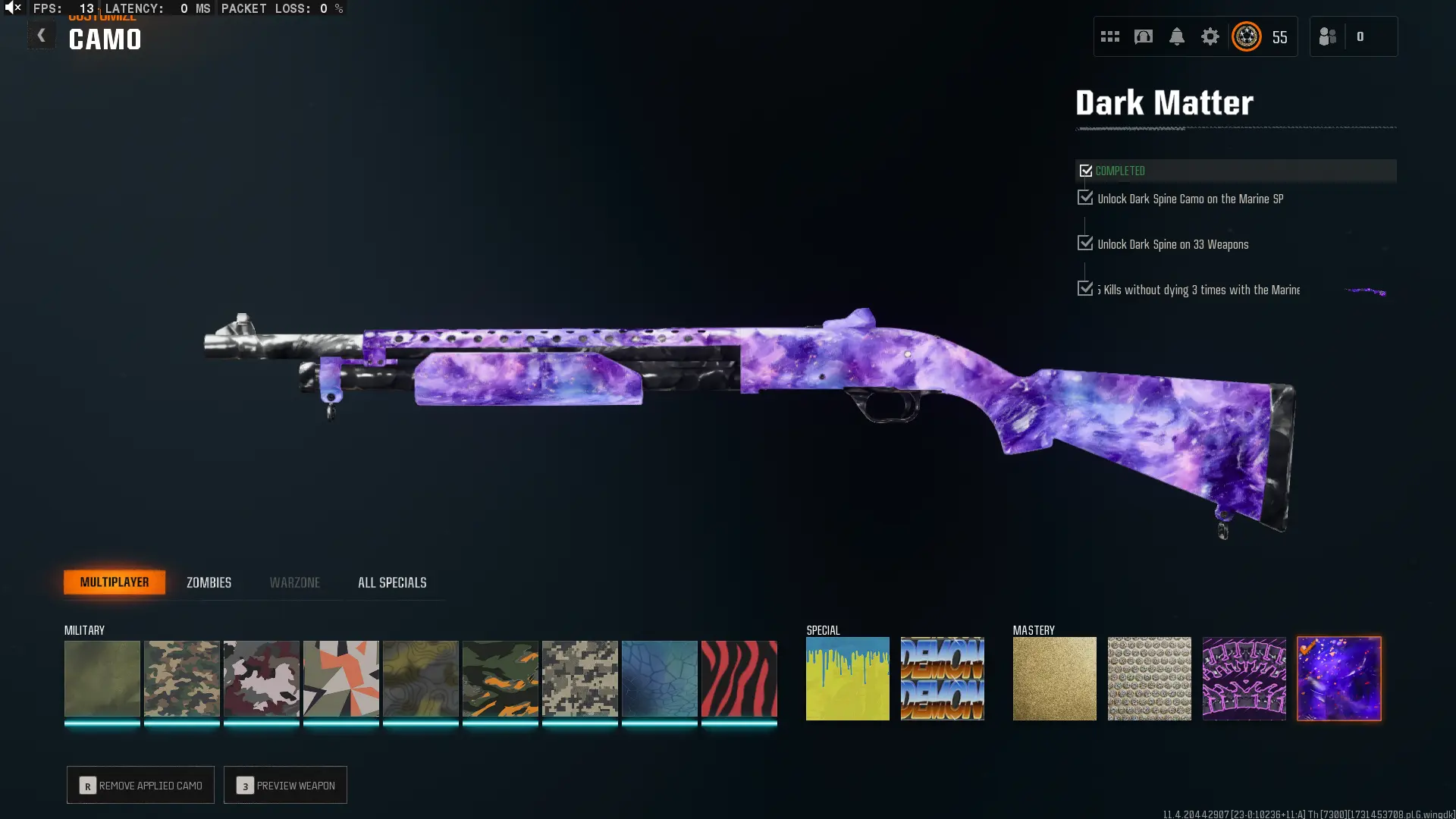🌌 BO6 & Warzone 🌌 33 Dark Matter 🐉Prestige 4 🌌 459 Camos⚔️ Level 55 🔥 16 Operators 🕸️ Dark Spine 💎 Diamond✨ Gold Camos 🦾 Prestige-Ready🦾 Linkable to: Steam, Battle.net, PSN, Xbox 🌐 Black Ops 6