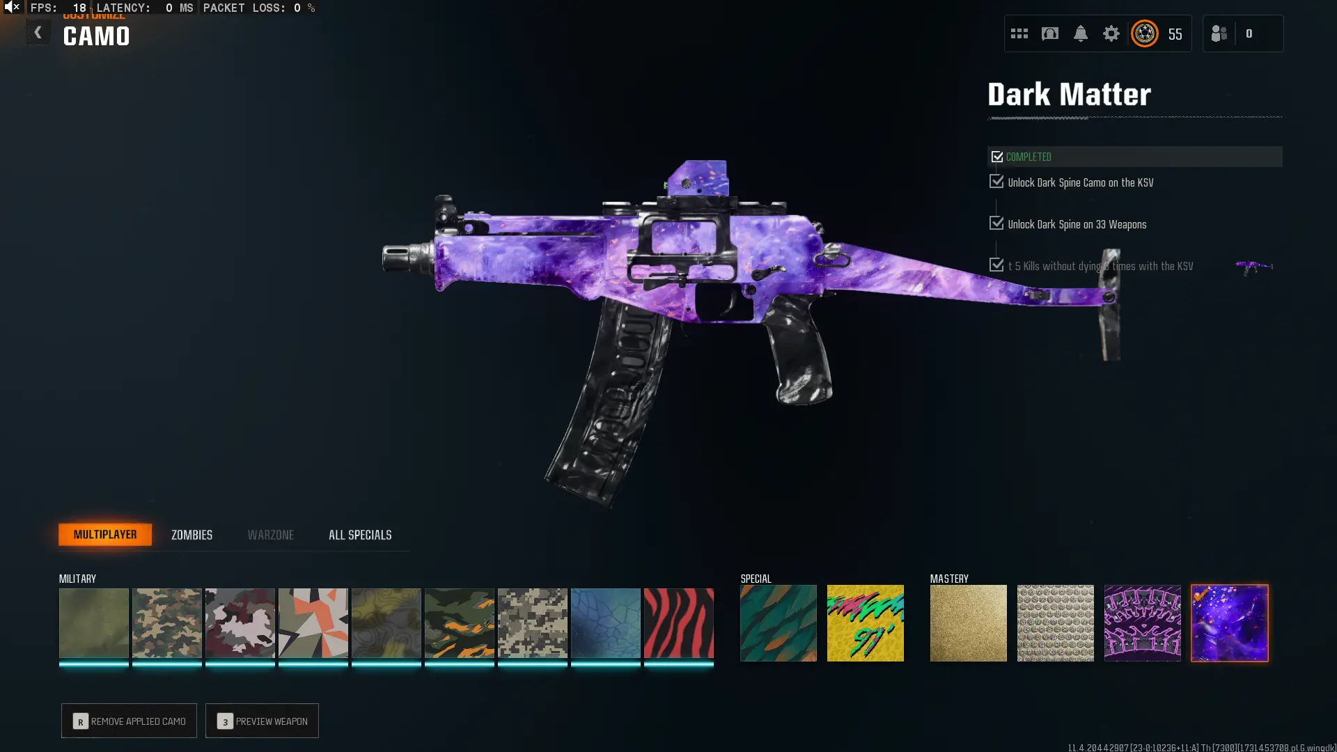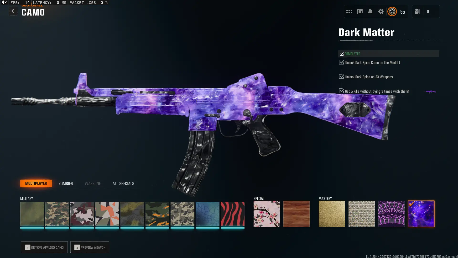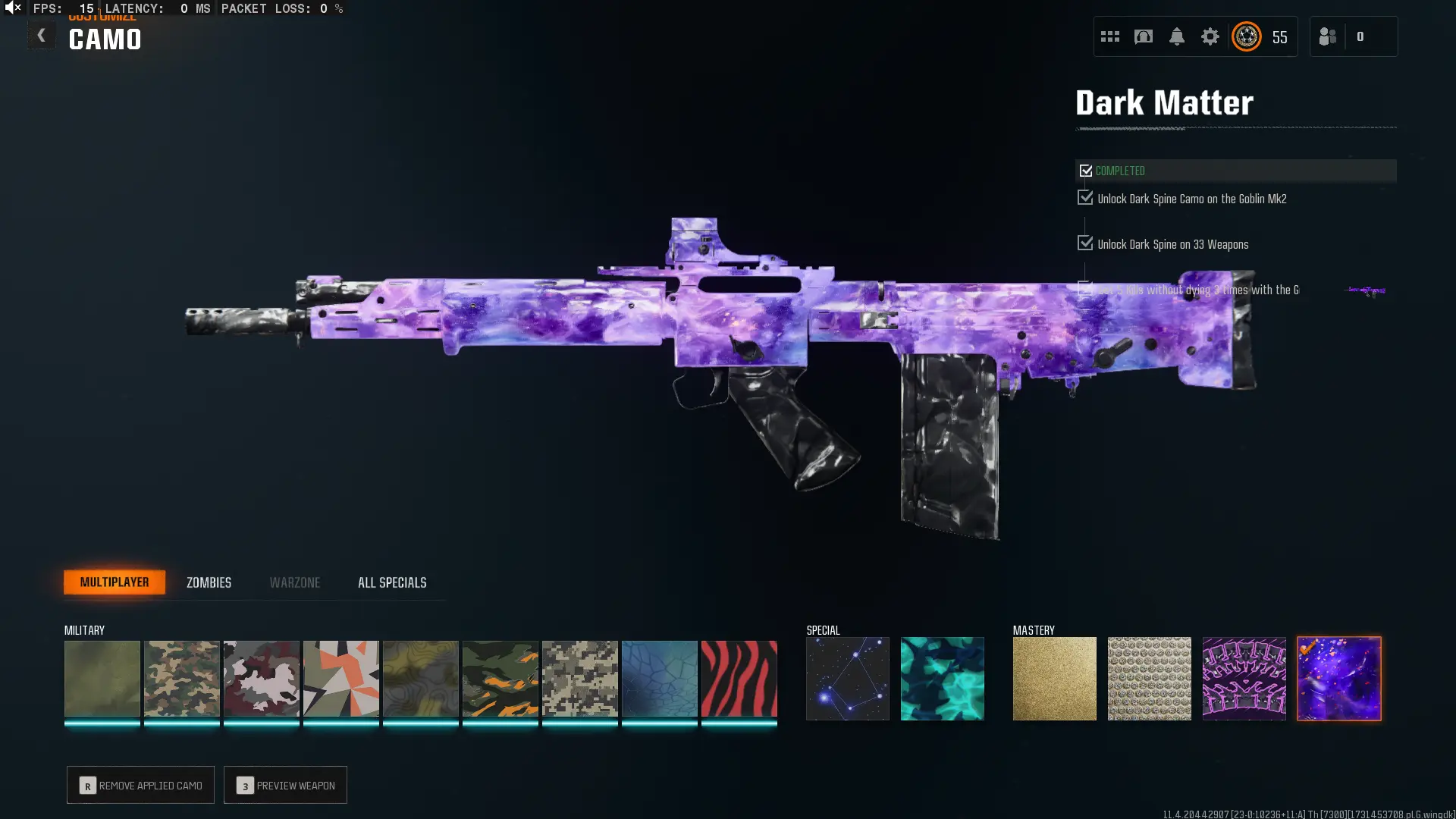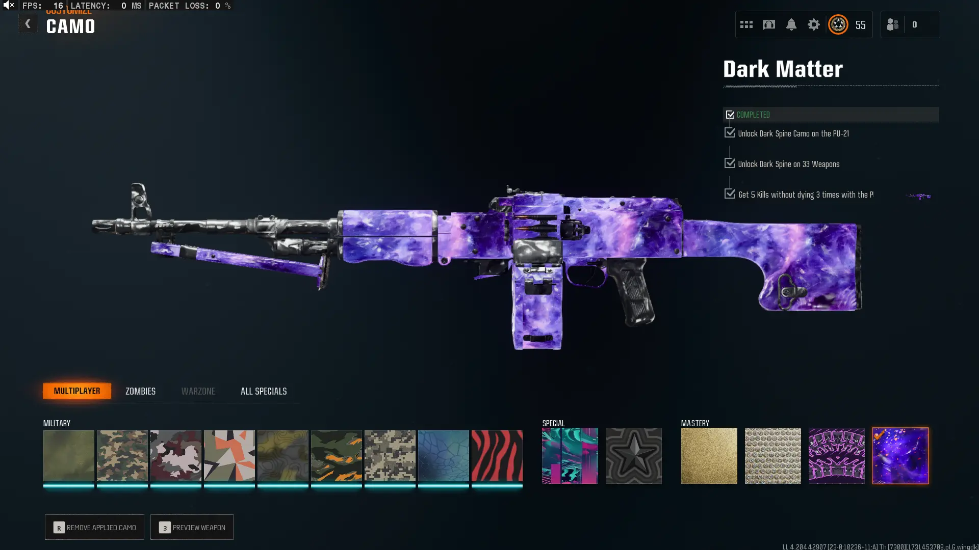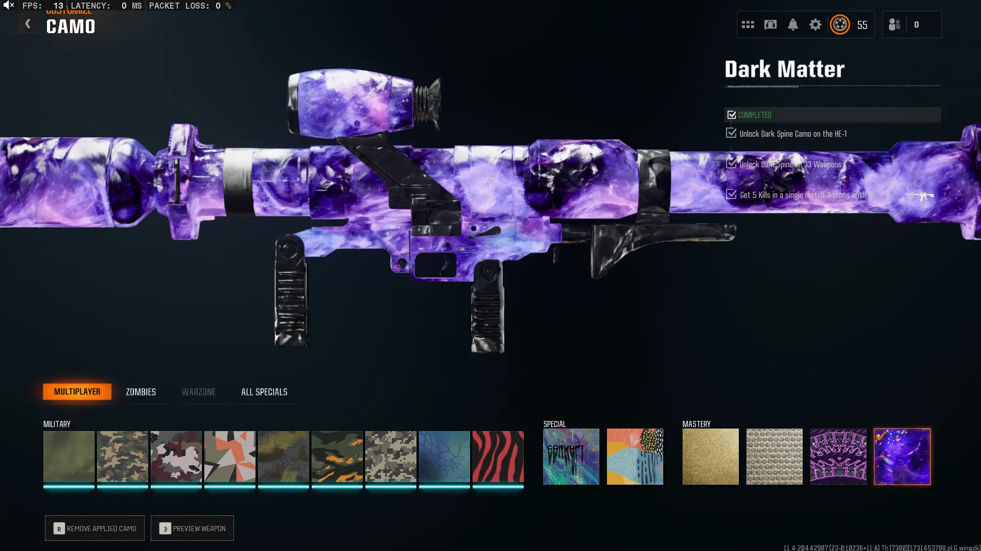 🌌 BO6 & Warzone 🌌 33 Dark Matter 🐉Prestige 4 🌌 459 Camos⚔️ Level 55 🔥 16 Operators 🕸️ Dark Spine 💎 Diamond✨ Gold Camos 🦾 Prestige-Ready🦾 Linkable to: Steam, Battle.net, PSN, Xbox 🌐 Black Ops 6